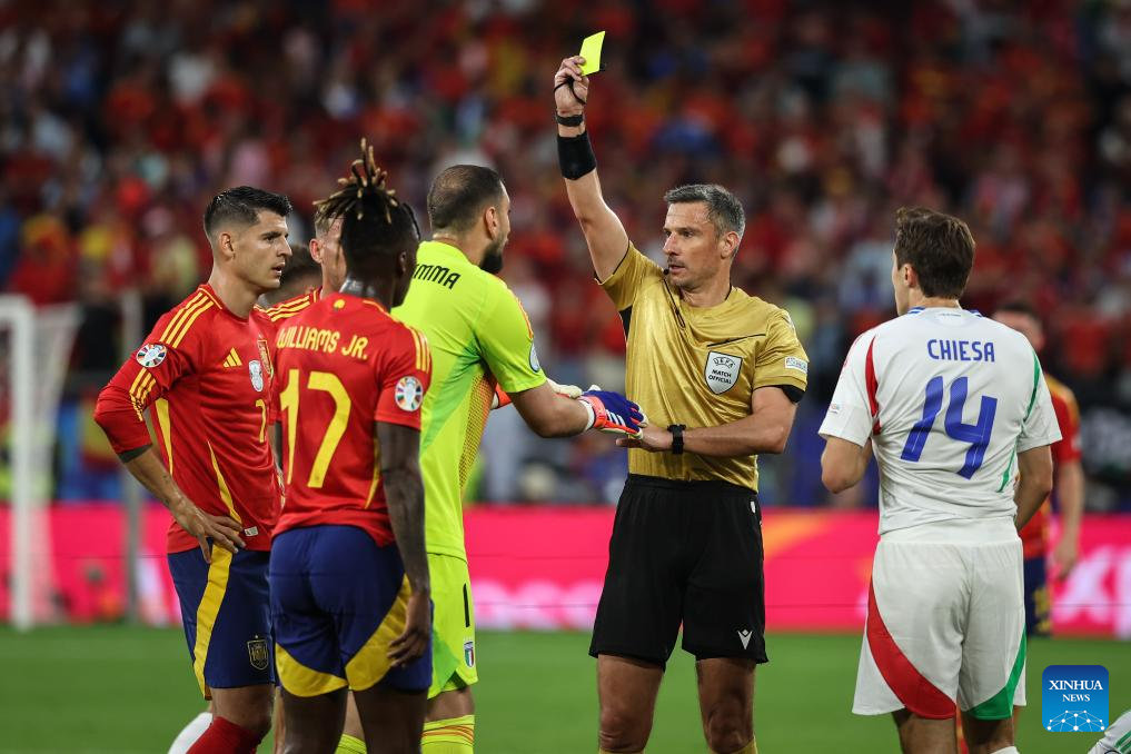GELSENKIRCHEN, 21 junio, 2024 (Xinhua) -- Imagen del 20 de junio de 2024 del guardameta Gianluigi Donnarumma (3-d), de Italia, recibiendo una tarjeta amarilla durante el partido correspondiente al Grupo B de la EURO 2024 de la UEFA, entre España e Italia, en Gelsenkirchen, Alemania. (Xinhua/Pan Yulong)