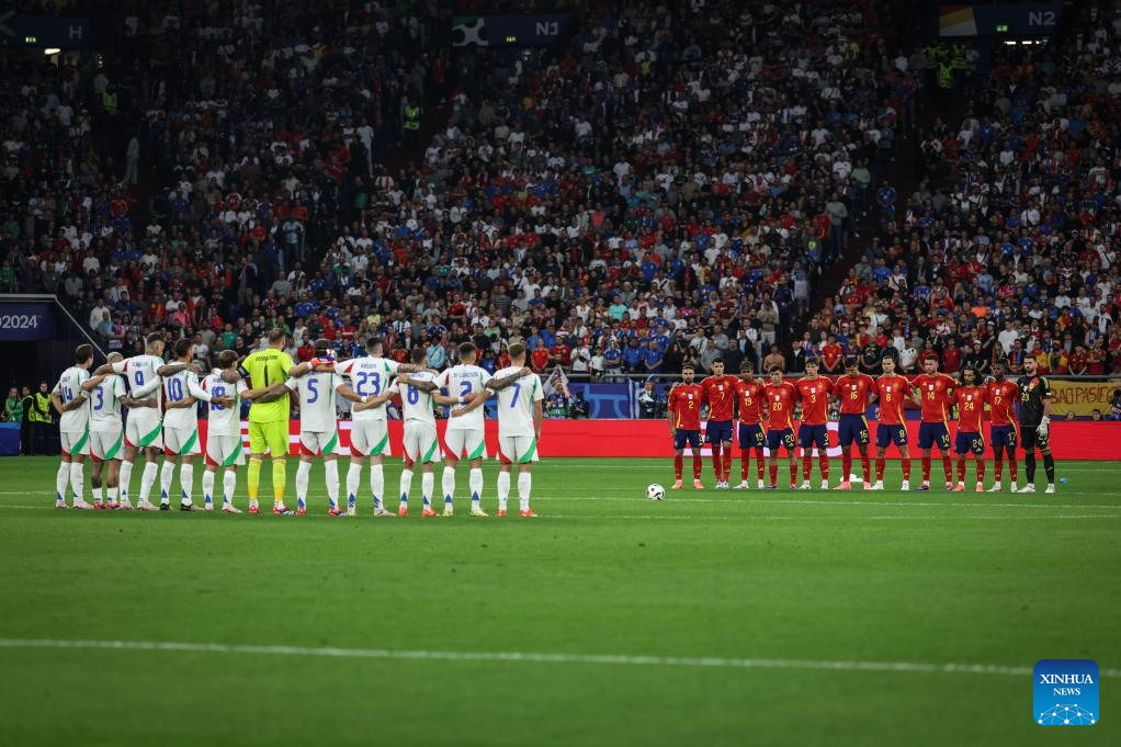 GELSENKIRCHEN, 21 junio, 2024 (Xinhua) -- Imagen del 20 de junio de 2024 de jugadores titulares de España e Italia manteniendo un minuto de silencio en memoria de Gerhard Aigner, exsecretario general de la UEFA, previo al partido correspondiente al Grupo B de la EURO 2024 de la UEFA, entre España e Italia, en Gelsenkirchen, Alemania. (Xinhua/Pan Yulong)