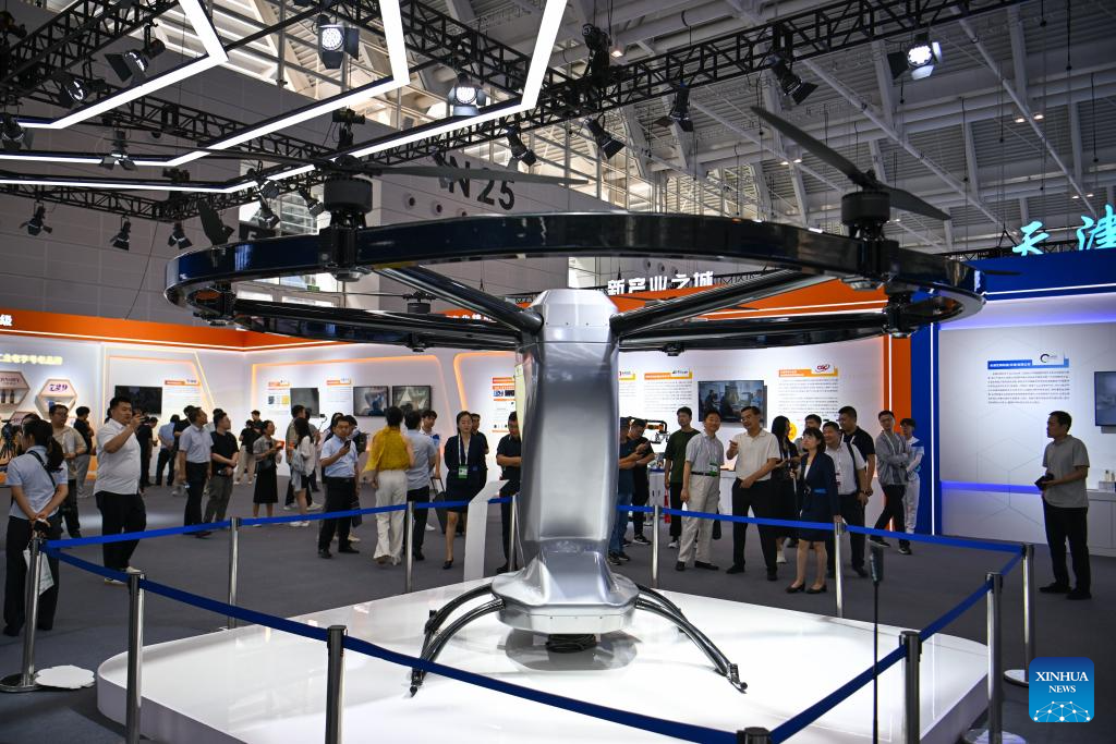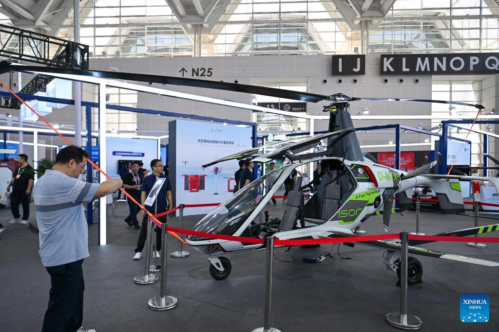 TIANJIN, 21 junio, 2024 (Xinhua) -- Imagen del 20 de junio de 2024 de visitantes observando una aeronave en el área de exposición sobre economía de baja altitud en la Exposición Mundial de Inteligencia 2024, en Tianjin, en el norte de China. La Exposición Mundial de Inteligencia 2024, bajo el tema "Inteligencia: Amplio Espacio de Desarrollo y Motor de Crecimiento Sostenible", se inauguró el jueves en Tianjin, en el norte de China, y la exposición sobre economía de baja altitud ha acaparado mucha atención. La creciente economía de baja altitud ha llevado al desarrollo y la aplicación de diversos tipos de vehículos aéreos innovadores para la logística, los desplazamientos, el turismo e incluso los deportes. Abarca una cadena de industrias, que incluyen la investigación y el desarrollo de aeronaves, la construcción y operación de infraestructura y los servicios para actividades de vuelo. (Xinhua/Sun Fanyue)