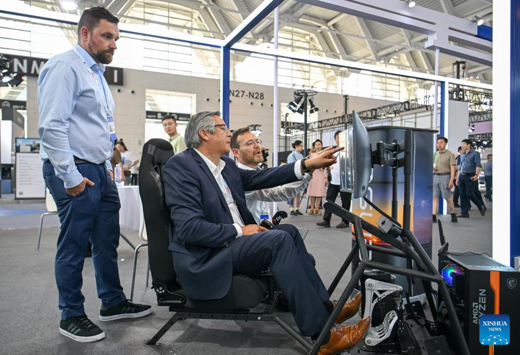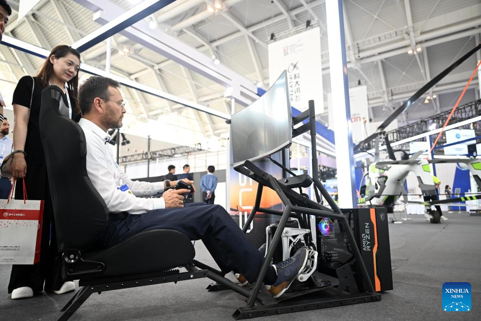TIANJIN, 21 junio, 2024 (Xinhua) -- Imagen del 20 de junio de 2024 de un visitante experimentando el vuelo simulado de una aeronave en el área de exposición sobre economía de baja altitud en la Exposición Mundial de Inteligencia 2024, en Tianjin, en el norte de China. La Exposición Mundial de Inteligencia 2024, bajo el tema "Inteligencia: Amplio Espacio de Desarrollo y Motor de Crecimiento Sostenible", se inauguró el jueves en Tianjin, en el norte de China, y la exposición sobre economía de baja altitud ha acaparado mucha atención. La creciente economía de baja altitud ha llevado al desarrollo y la aplicación de diversos tipos de vehículos aéreos innovadores para la logística, los desplazamientos, el turismo e incluso los deportes. Abarca una cadena de industrias, que incluyen la investigación y el desarrollo de aeronaves, la construcción y operación de infraestructura y los servicios para actividades de vuelo. (Xinhua/Zhao Zishuo)