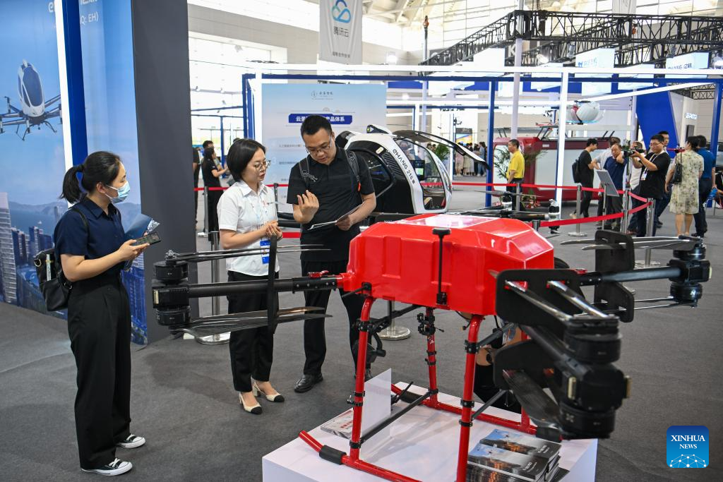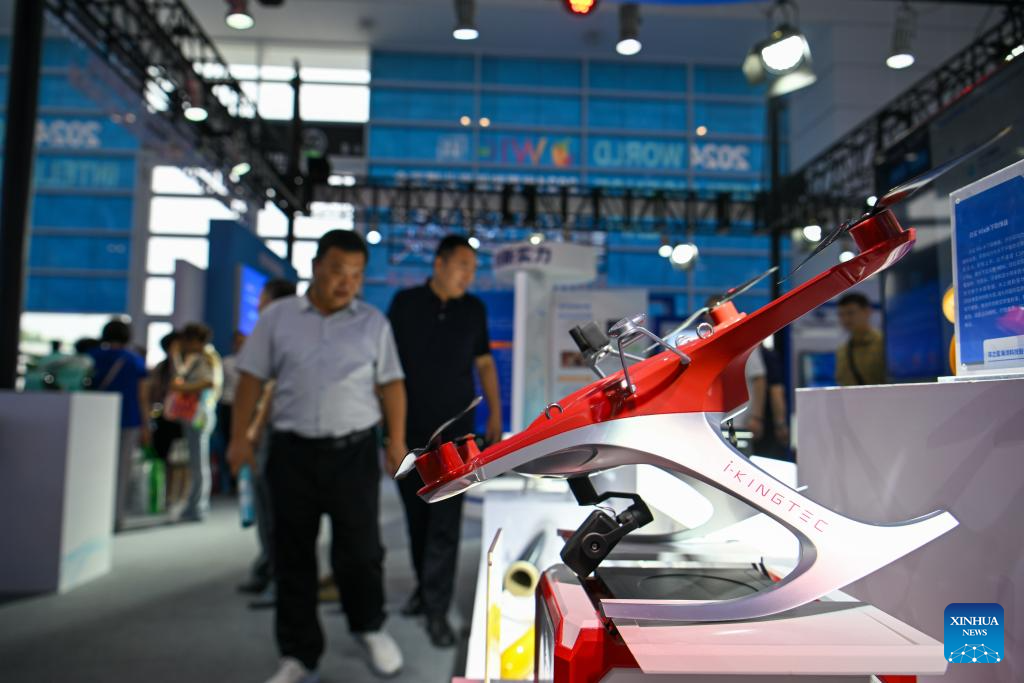 TIANJIN, 21 junio, 2024 (Xinhua) -- Visitantes observan drones en el área de exposición sobre economía de baja altitud en la Exposición Mundial de Inteligencia 2024, en Tianjin, en el norte de China, el 21 de junio de 2024. La Exposición Mundial de Inteligencia 2024, bajo el tema "Inteligencia: Amplio Espacio de Desarrollo y Motor de Crecimiento Sostenible", se inauguró el jueves en Tianjin, en el norte de China, y la exposición sobre economía de baja altitud ha acaparado mucha atención. La creciente economía de baja altitud ha llevado al desarrollo y la aplicación de diversos tipos de vehículos aéreos innovadores para la logística, los desplazamientos, el turismo e incluso los deportes. Abarca una cadena de industrias, que incluyen la investigación y el desarrollo de aeronaves, la construcción y operación de infraestructura y los servicios para actividades de vuelo. (Xinhua/Sun Fanyue)