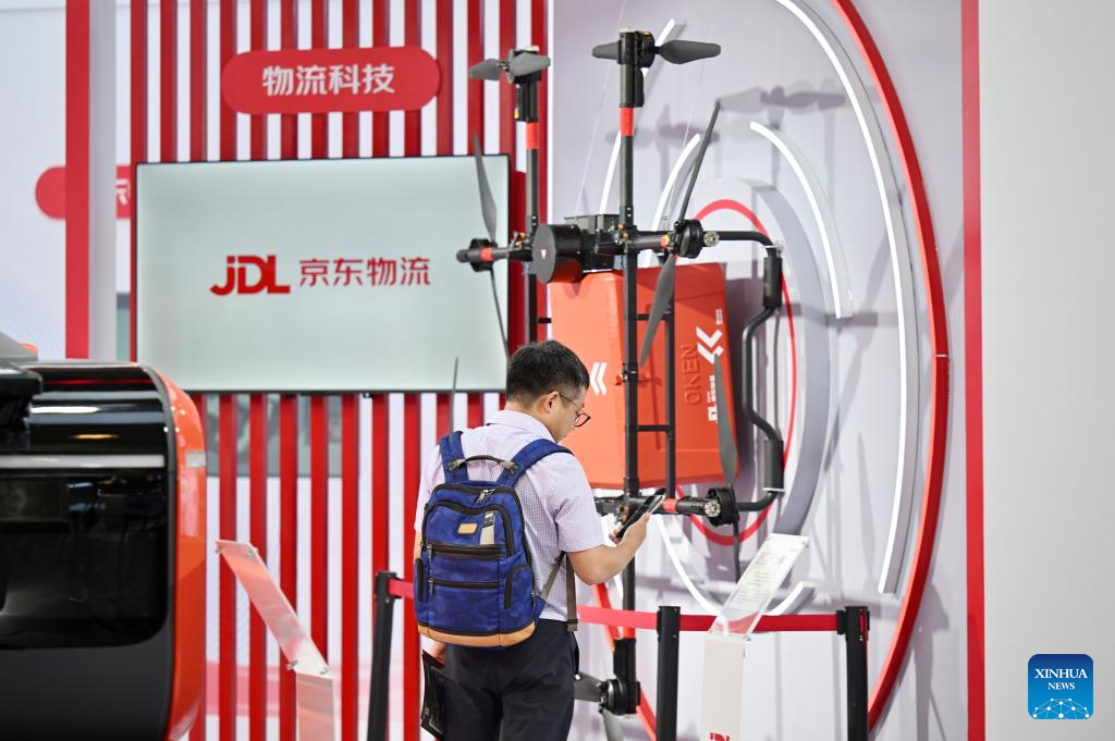 TIANJIN, 21 junio, 2024 (Xinhua) -- Un visitante observa un dron de entrega en el área de exposición sobre economía de baja altitud en la Exposición Mundial de Inteligencia 2024, en Tianjin, en el norte de China, el 21 de junio de 2024. La Exposición Mundial de Inteligencia 2024, bajo el tema "Inteligencia: Amplio Espacio de Desarrollo y Motor de Crecimiento Sostenible", se inauguró el jueves en Tianjin, en el norte de China, y la exposición sobre economía de baja altitud ha acaparado mucha atención. La creciente economía de baja altitud ha llevado al desarrollo y la aplicación de diversos tipos de vehículos aéreos innovadores para la logística, los desplazamientos, el turismo e incluso los deportes. Abarca una cadena de industrias, que incluyen la investigación y el desarrollo de aeronaves, la construcción y operación de infraestructura y los servicios para actividades de vuelo. (Xinhua/Li Ran)