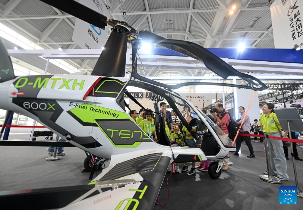 TIANJIN, 21 junio, 2024 (Xinhua) -- Visitantes observan un helicóptero en el área de exposición sobre economía de baja altitud en la Exposición Mundial de Inteligencia 2024, en Tianjin, en el norte de China, el 21 de junio de 2024. La Exposición Mundial de Inteligencia 2024, bajo el tema "Inteligencia: Amplio Espacio de Desarrollo y Motor de Crecimiento Sostenible", se inauguró el jueves en Tianjin, en el norte de China, y la exposición sobre economía de baja altitud ha acaparado mucha atención. La creciente economía de baja altitud ha llevado al desarrollo y la aplicación de diversos tipos de vehículos aéreos innovadores para la logística, los desplazamientos, el turismo e incluso los deportes. Abarca una cadena de industrias, que incluyen la investigación y el desarrollo de aeronaves, la construcción y operación de infraestructura y los servicios para actividades de vuelo. (Xinhua/Zhao Zishuo)