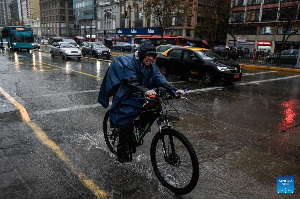 SANTIAGO, 21 junio, 2024 (Xinhua) -- Una persona porta un impermeable para protegerse de la lluvia mientras conduce una bicicleta, en Santiago, capital de Chile, el 21 de junio de 2024. (Xinhua/Jorge Villegas)