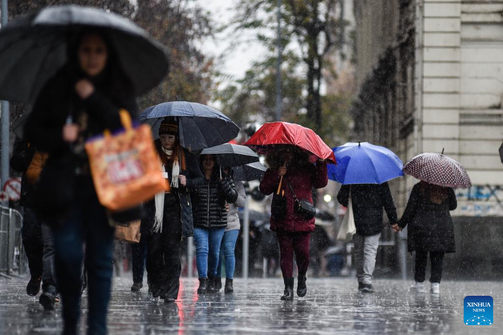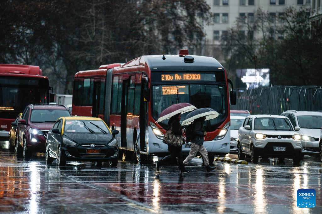 SANTIAGO, 21 junio, 2024 (Xinhua) -- Personas caminan por una calle mientras sostienen paraguas para protegerse de la lluvia, en Santiago, capital de Chile, el 21 de junio de 2024. (Xinhua/Jorge Villegas)