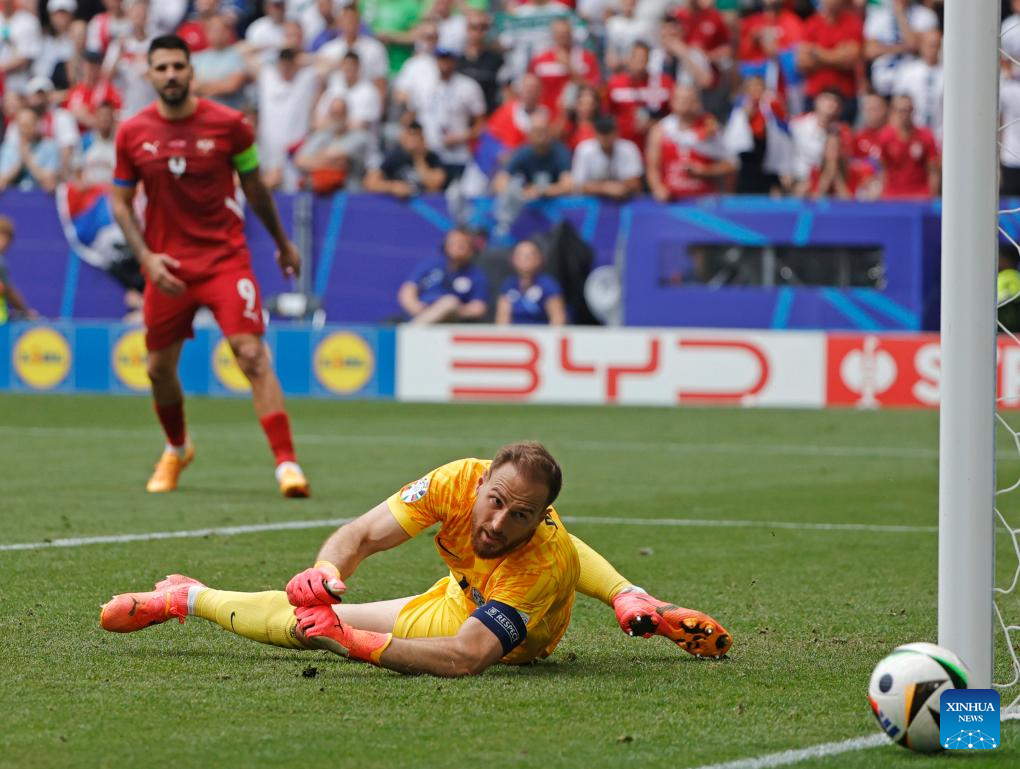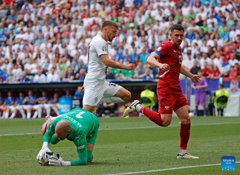 MUNICH, 21 junio, 2024 (Xinhua) -- Imagen del 20 de junio de 2024 del guardameta Predrag Rajkovic (i), de Serbia, atajando el balón durante el partido correspondiente al Grupo C de la EURO 2024 de la UEFA, entre Eslovenia y Serbia, en Múnich, Alemania. (Xinhua/Philippe Ruiz)