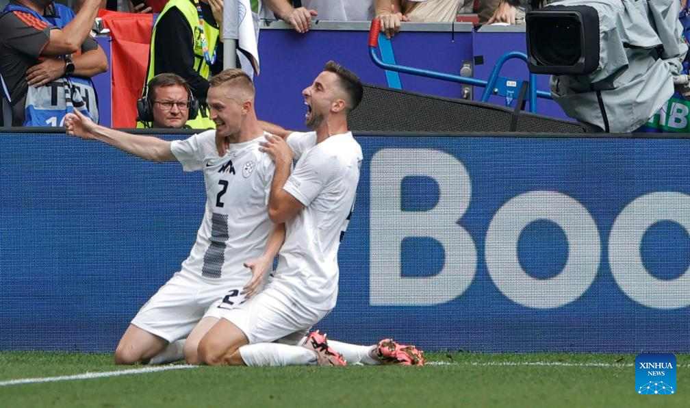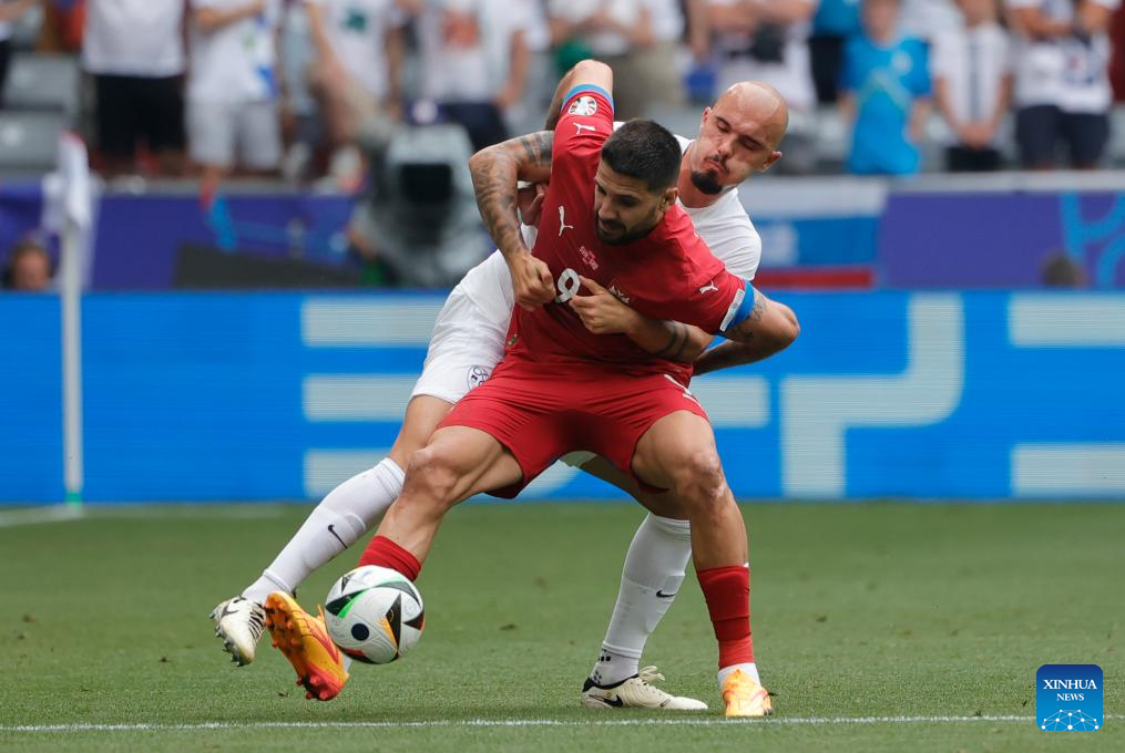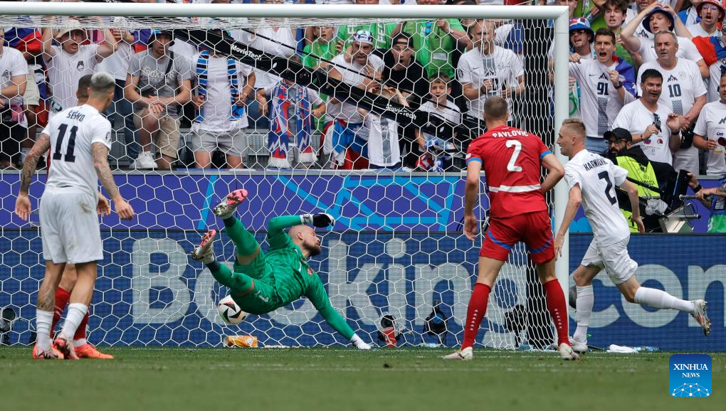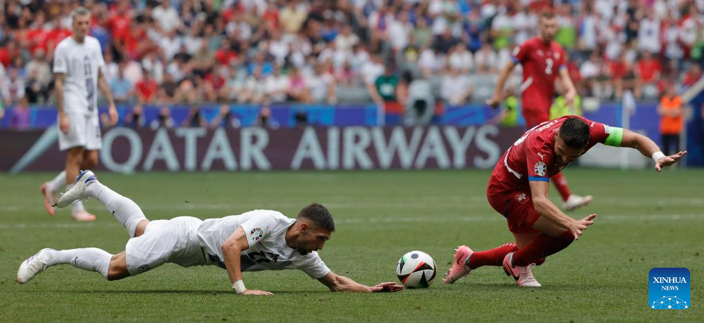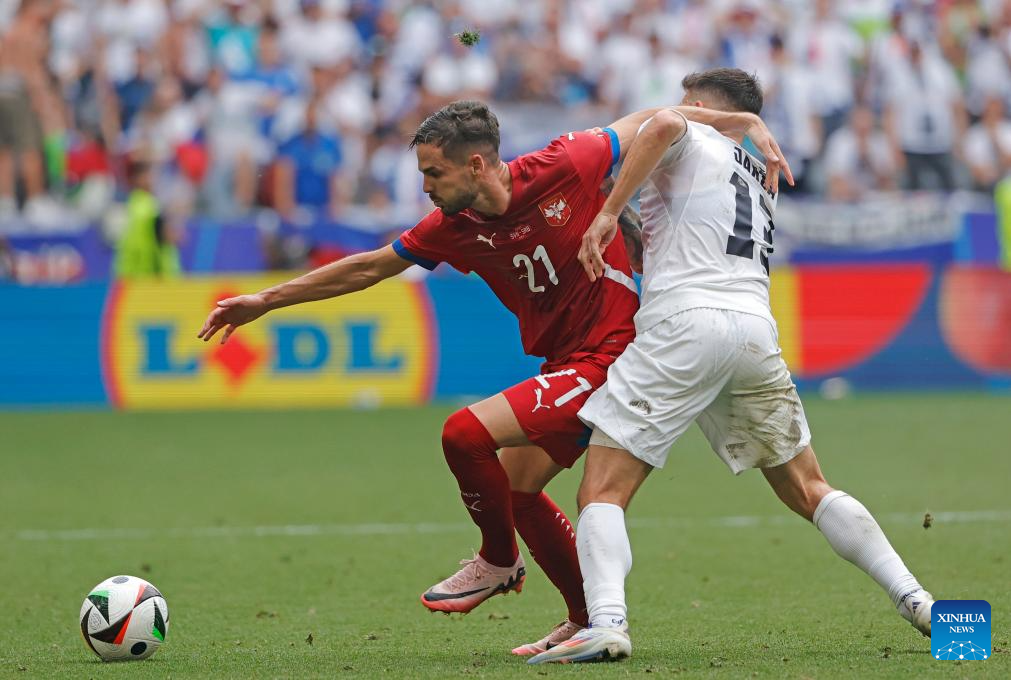 MUNICH, 21 junio, 2024 (Xinhua) -- Imagen del 20 de junio de 2024 de Zan Karnicnik (d), de Eslovenia, disparando para anotar durante el partido durante el partido correspondiente al Grupo C de la EURO 2024 de la UEFA, entre Eslovenia y Serbia, en Múnich, Alemania. (Xinhua/Philippe Ruiz)