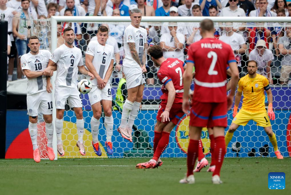 MUNICH, 21 junio, 2024 (Xinhua) -- Imagen del 20 de junio de 2024 de jugadores de Eslovenia defendiendo un tiro libre de Dusan Vlahovic (3-d), de Serbia, durante el partido correspondiente al Grupo C de la EURO 2024 de la UEFA, entre Eslovenia y Serbia, en Múnich, Alemania. (Xinhua/Philippe Ruiz)