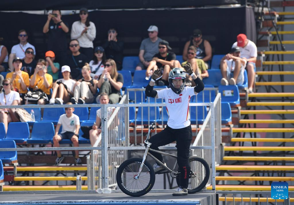 BUDAPEST, 21 junio, 2024 (Xinhua) -- Sun Jiaqi, de China, saluda al público previo a la clasificatoria de park femenino de ciclismo BMX freestyle en las Series de Clasificación Olímpica de Budapest, en Budapest, Hungría, el 21 de junio de 2024. (Xinhua/He Canling)
