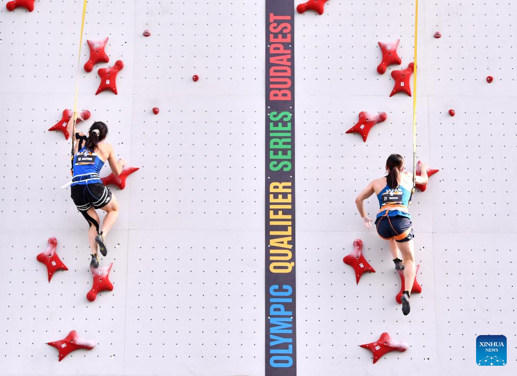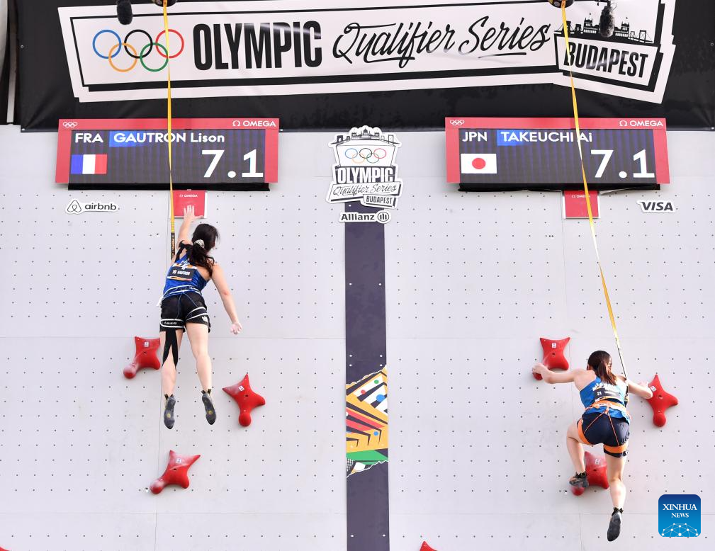 BUDAPEST, 22 junio, 2024 (Xinhua) -- Imagen del 21 de junio de 2024 de Gautron Lison (i), de Francia, y Takeuchi Ai, de Japón, compitiendo durante la clasificatoria de velocidad femenina de escalada deportiva en las Series de Clasificación Olímpica de Budapest, en Budapest, Hungría. (Xinhua/Lian Yi)