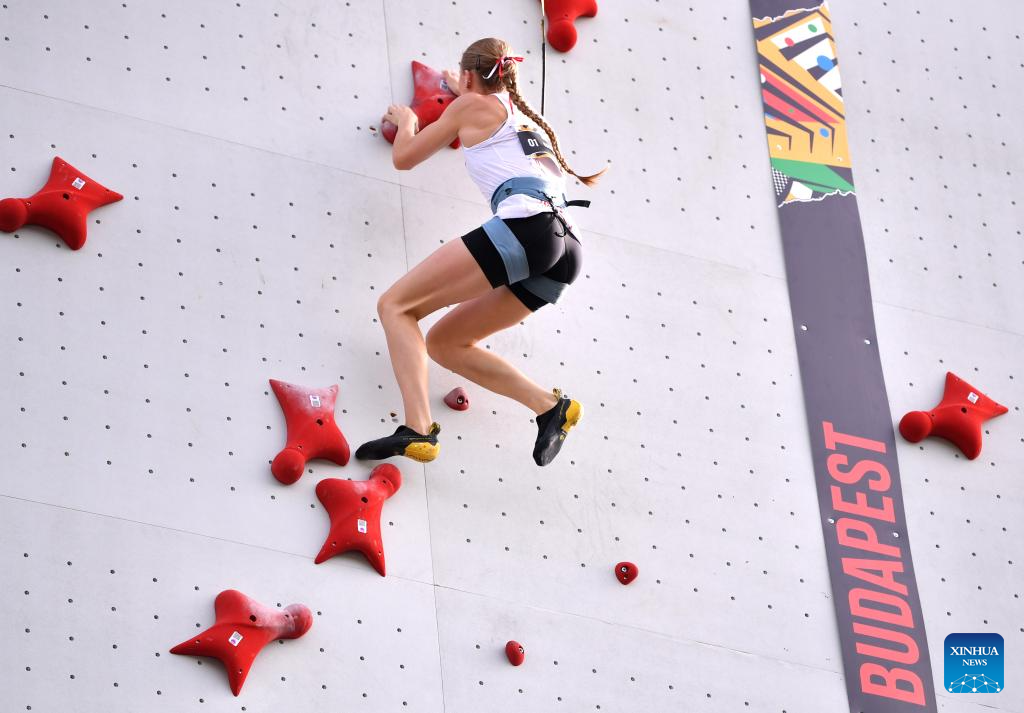 BUDAPEST, 22 junio, 2024 (Xinhua) -- Imagen del 21 de junio de 2024 de Natalia Kalucka, de Polonia, compitiendo durante la clasificatoria de velocidad femenina de escalada deportiva en las Series de Clasificación Olímpica de Budapest, en Budapest, Hungría. (Xinhua/Lian Yi)