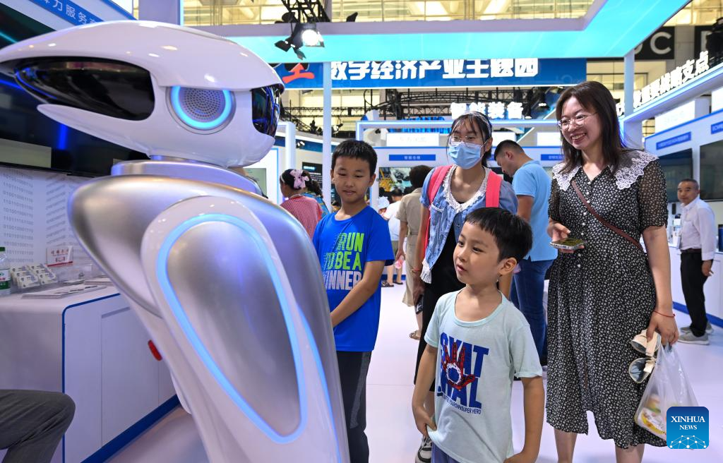 TIANJIN, 22 junio, 2024 (Xinhua) -- Visitantes interactúan con un robot en la Exposición Mundial de Inteligencia 2024, en Tianjin, en el norte de China, el 22 de junio de 2024. Desde robots de café a robots humanoides, la exposición de cuatro días destacó los diversos escenarios de aplicación de los robots. La Exposición Mundial de Inteligencia 2024 con el tema de "Inteligencia: Amplio espacio de desarrollo, motor de crecimiento sostenible", fue inaugurada el jueves en la municipalidad de Tianjin, en el norte de China. (Xinhua/Sun Fanyue)