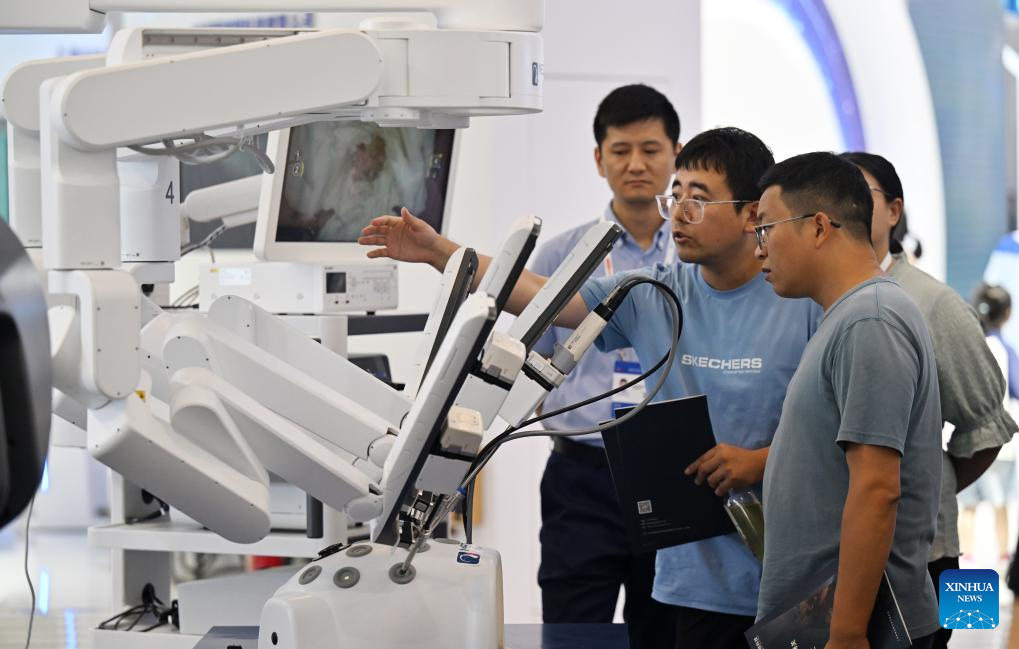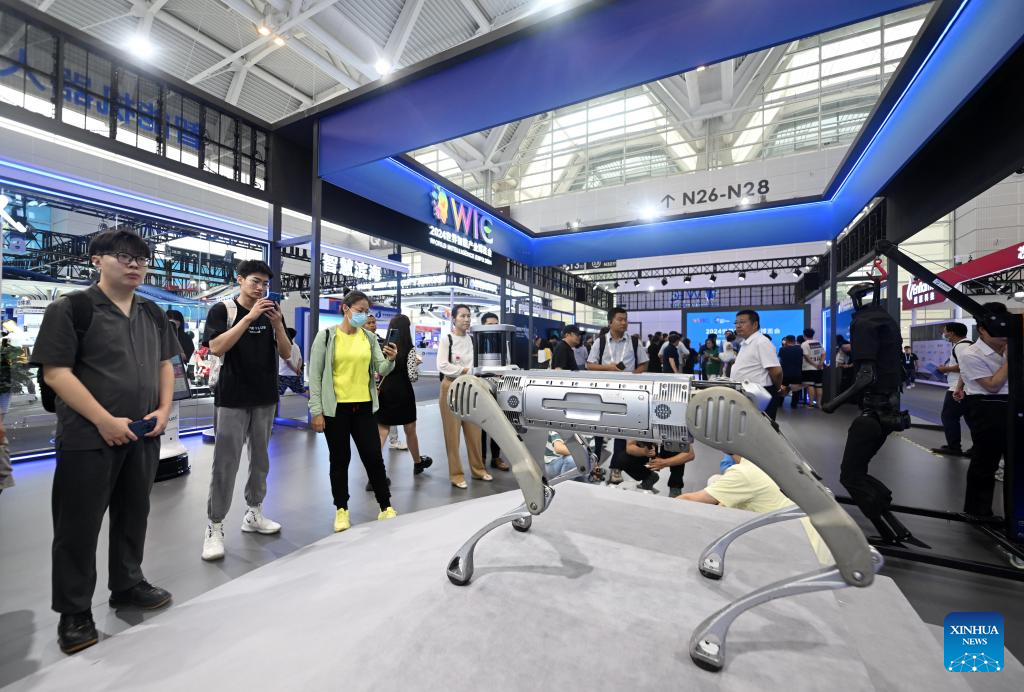 TIANJIN, 22 junio, 2024 (Xinhua) -- Personas observan exhibiciones de robots en la Exposición Mundial de Inteligencia 2024, en Tianjin, en el norte de China, el 22 de junio de 2024. El día abierto al público de la exposición se llevó a cabo el sábado en Tianjin. (Xinhua/Li Ran)
