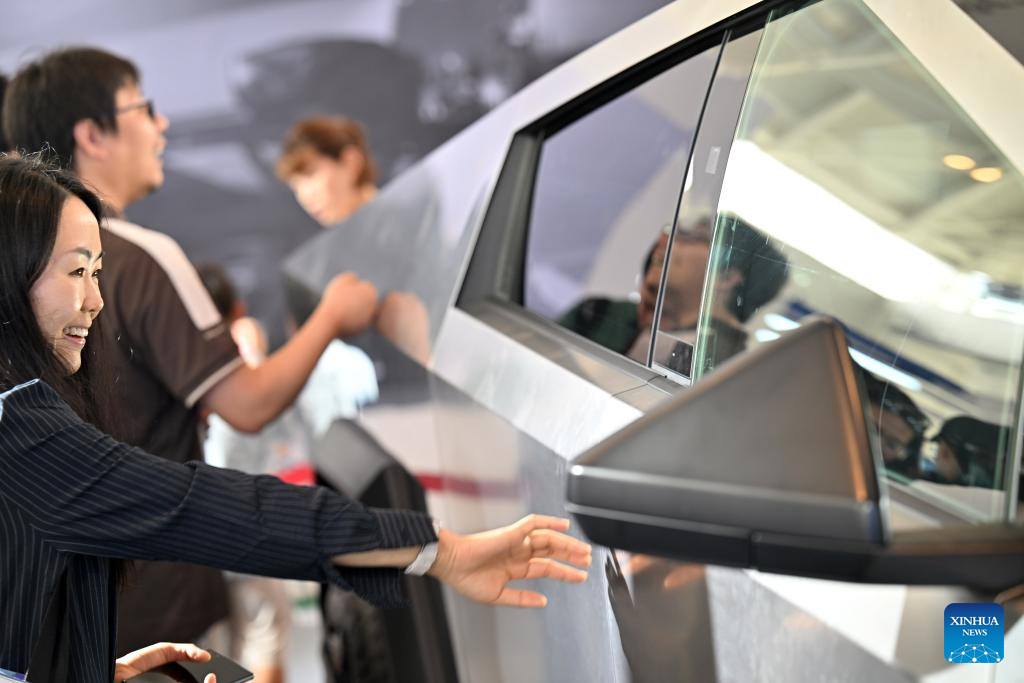 TIANJIN, 22 junio, 2024 (Xinhua) -- Personas visitan el estand de Tesla durante la Exposición Mundial de Inteligencia 2024, en Tianjin, en el norte de China. el 22 de junio de 2024. El día abierto al público de la exposición se llevó a cabo el sábado en Tianjin. (Xinhua/Li Ran)