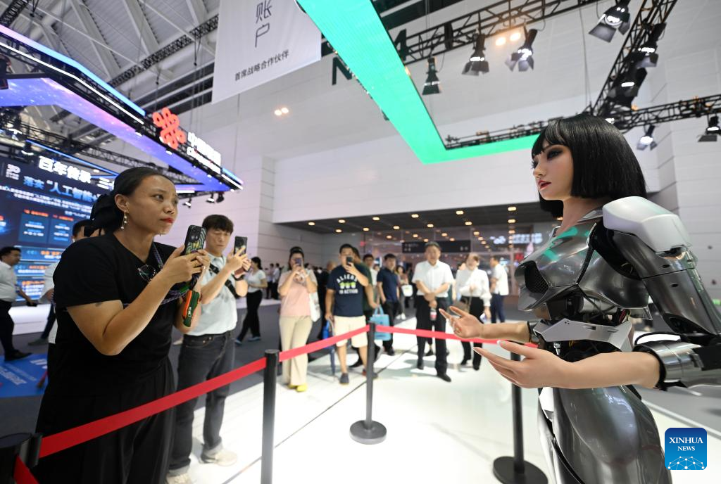 TIANJIN, 22 junio, 2024 (Xinhua) -- Imagen del 21 de junio de 2024 de una visitante interactuando con una robot humanoide en la Exposición Mundial de Inteligencia 2024, en Tianjin, en el norte de China. Desde robots de café a robots humanoides, la exposición de cuatro días destacó los diversos escenarios de aplicación de los robots. La Exposición Mundial de Inteligencia 2024 con el tema de "Inteligencia: Amplio espacio de desarrollo, motor de crecimiento sostenible", fue inaugurada el jueves en la municipalidad de Tianjin, en el norte de China. (Xinhua/Zhao Zishuo)