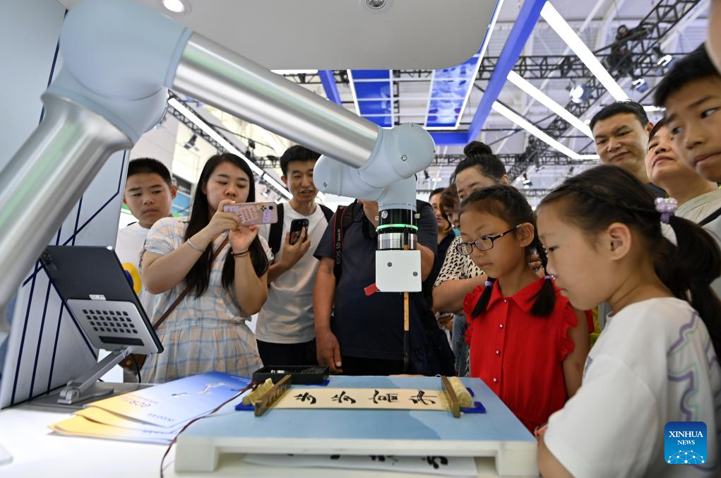 TIANJIN, 22 junio, 2024 (Xinhua) -- Visitantes observan cómo un robot escribe caligrafía china en la Exposición Mundial de Inteligencia 2024, en Tianjin, en el norte de China, el 22 de junio de 2024. Desde robots de café a robots humanoides, la exposición de cuatro días destacó los diversos escenarios de aplicación de los robots. La Exposición Mundial de Inteligencia 2024 con el tema de "Inteligencia: Amplio espacio de desarrollo, motor de crecimiento sostenible", fue inaugurada el jueves en la municipalidad de Tianjin, en el norte de China. (Xinhua/Li Ran)
