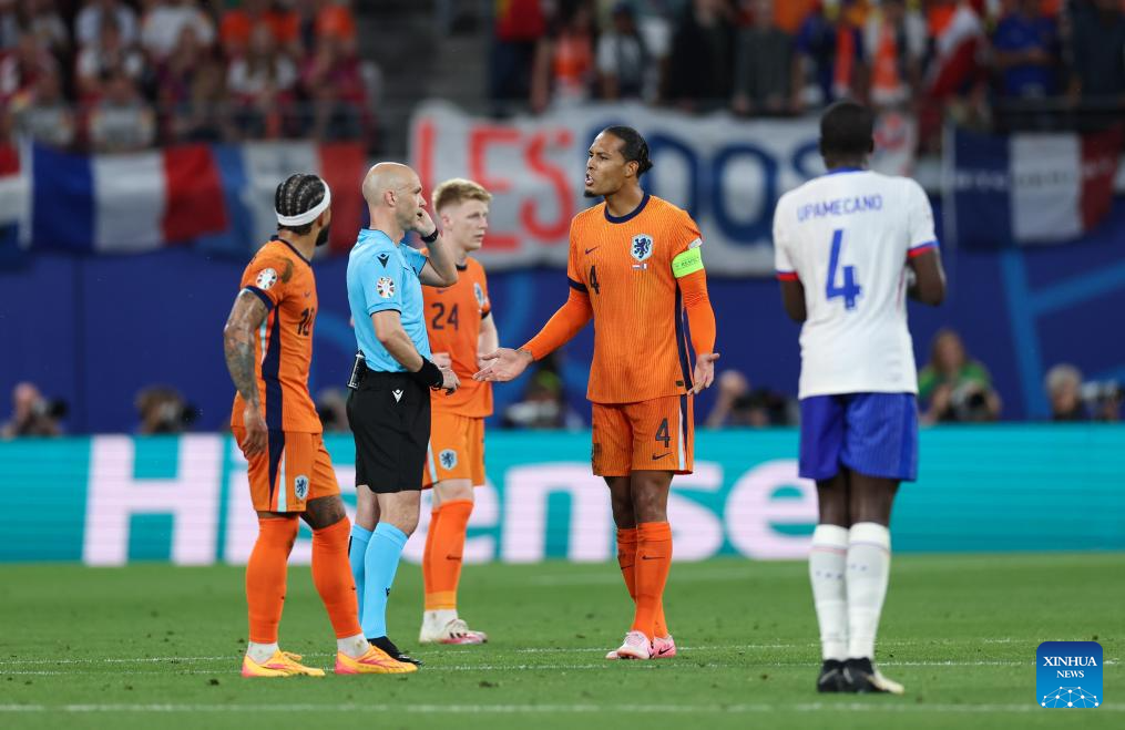 LEIPZIG, 22 junio, 2024 (Xinhua) -- Imagen del 21 de junio de 2024 de Virgil van Dijk (2-d), de Países Bajos, hablando con el árbitro Anthony Taylor durante el partido correspondiente al Grupo D de la EURO 2024 de la UEFA, entre Francia y Países Bajos, en Leipzig, Alemania. (Xinhua/Bai Xuefei)