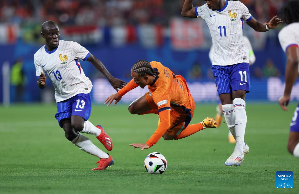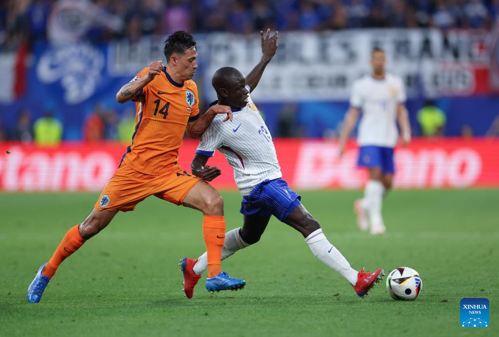 LEIPZIG, 22 junio, 2024 (Xinhua) -- Imagen del 21 de junio de 2024 de N'Golo Kante (d), de Francia, compitiendo con Tijjani Reijnders, de Países Bajos, durante el partido correspondiente al Grupo D de la EURO 2024 de la UEFA, entre Francia y Países Bajos, en Leipzig, Alemania. (Xinhua/Bai Xuefei)