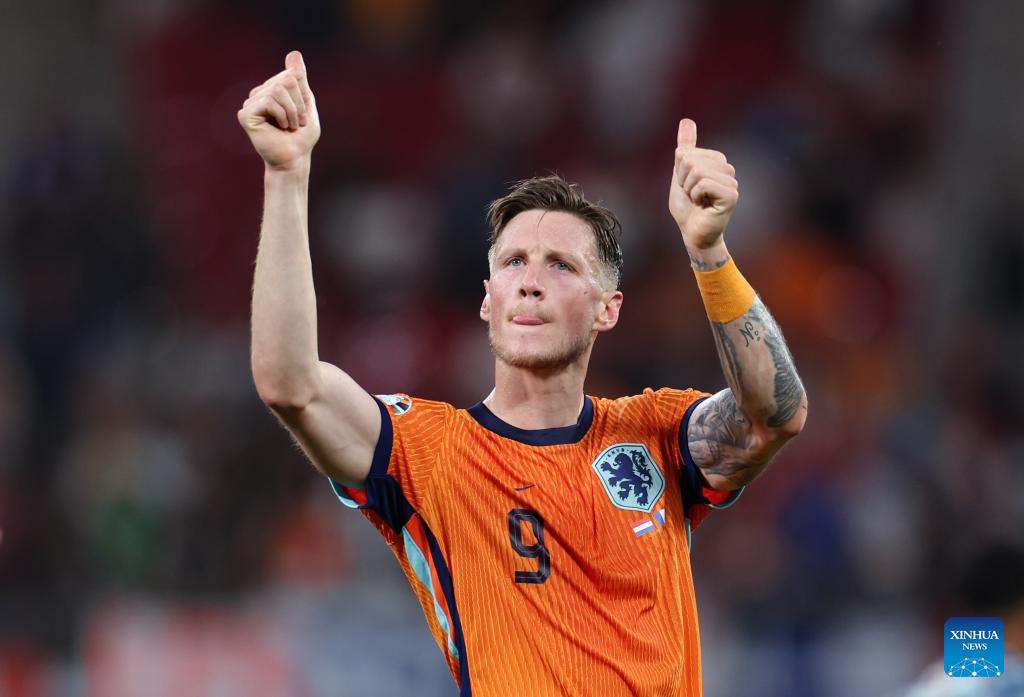 LEIPZIG, 22 junio, 2024 (Xinhua) -- Imagen del 21 de junio de 2024 de Wout Weghorst, de Países Bajos, saludando a los espectadores al término del partido correspondiente al Grupo D de la EURO 2024 de la UEFA, entre Francia y Países Bajos, en Leipzig, Alemania. (Xinhua/Bai Xuefei)