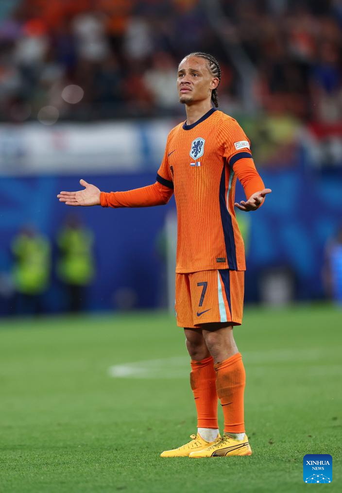 LEIPZIG, 22 junio, 2024 (Xinhua) -- Imagen del 21 de junio de 2024 de Xavi Simons, de Países Bajos, reaccionando después de que su anotación fuera anulada durante el partido correspondiente al Grupo D de la EURO 2024 de la UEFA, entre Francia y Países Bajos, en Leipzig, Alemania. (Xinhua/Bai Xuefei)