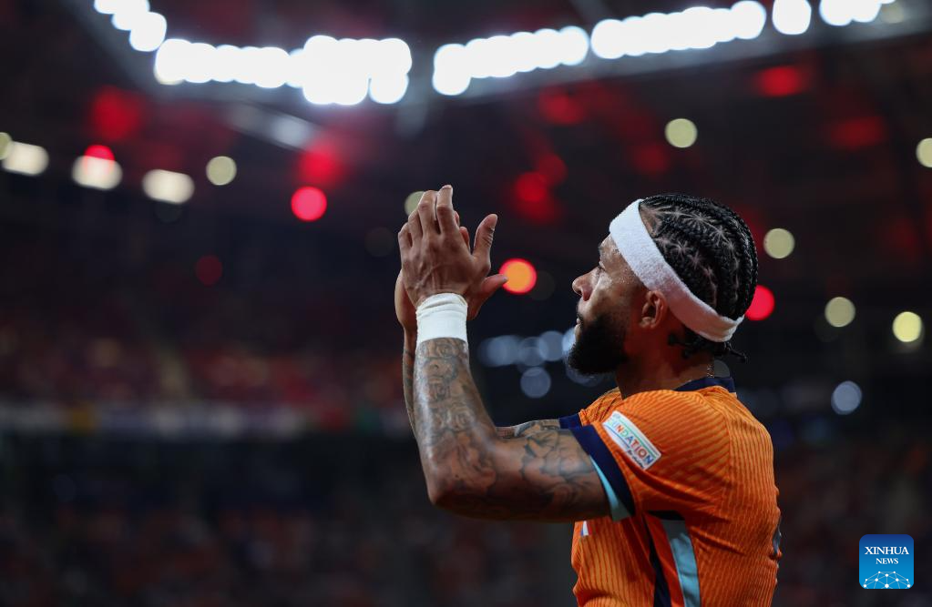 LEIPZIG, 22 junio, 2024 (Xinhua) -- Imagen del 21 de junio de 2024 de Memphis Depay, de Países Bajos, saludando a los espectadores al término del partido correspondiente al Grupo D de la EURO 2024 de la UEFA, entre Francia y Países Bajos, en Leipzig, Alemania. (Xinhua/Bai Xuefei)