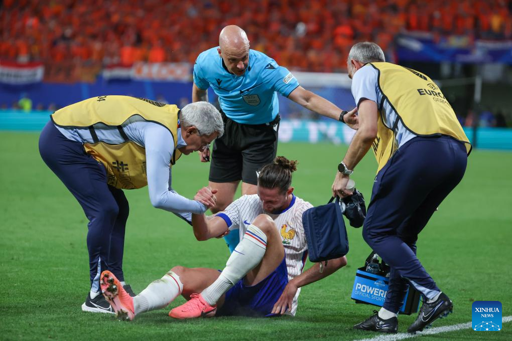 LEIPZIG, 22 junio, 2024 (Xinhua) -- Imagen del 21 de junio de 2024 de Adrien Rabiot (c), de Francia, recibiendo tratamiento médico durante el partido correspondiente al Grupo D de la EURO 2024 de la UEFA, entre Francia y Países Bajos, en Leipzig, Alemania. (Xinhua/Zhang Fan)