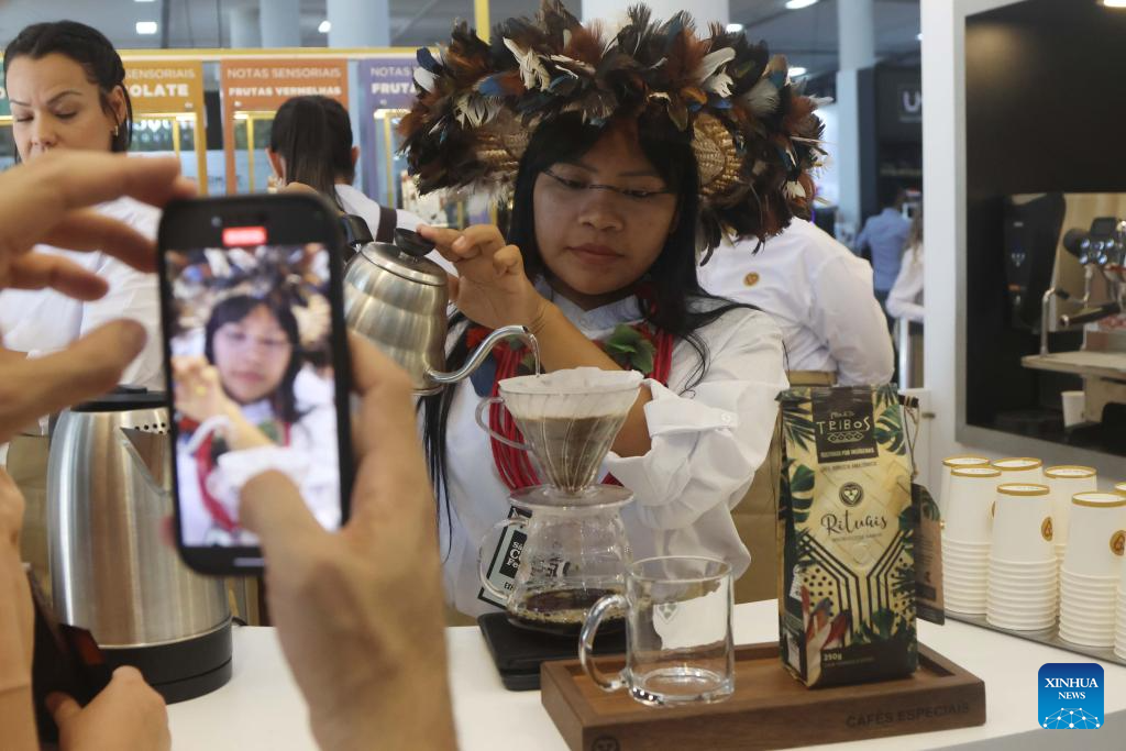SAO PAULO, 22 junio, 2024 (Xinhua) -- Imagen del 21 de junio de 2024 de una expositora preparando café durante el Festival del Café de Sao Paulo, en Sao Paulo, Brasil. (Xinhua/Rahel Patrasso)
