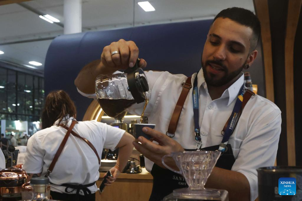 SAO PAULO, 22 junio, 2024 (Xinhua) -- Imagen del 21 de junio de 2024 de un expositor preparando café durante el Festival del Café de Sao Paulo, en Sao Paulo, Brasil. (Xinhua/Rahel Patrasso)