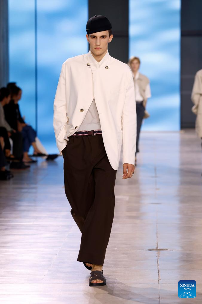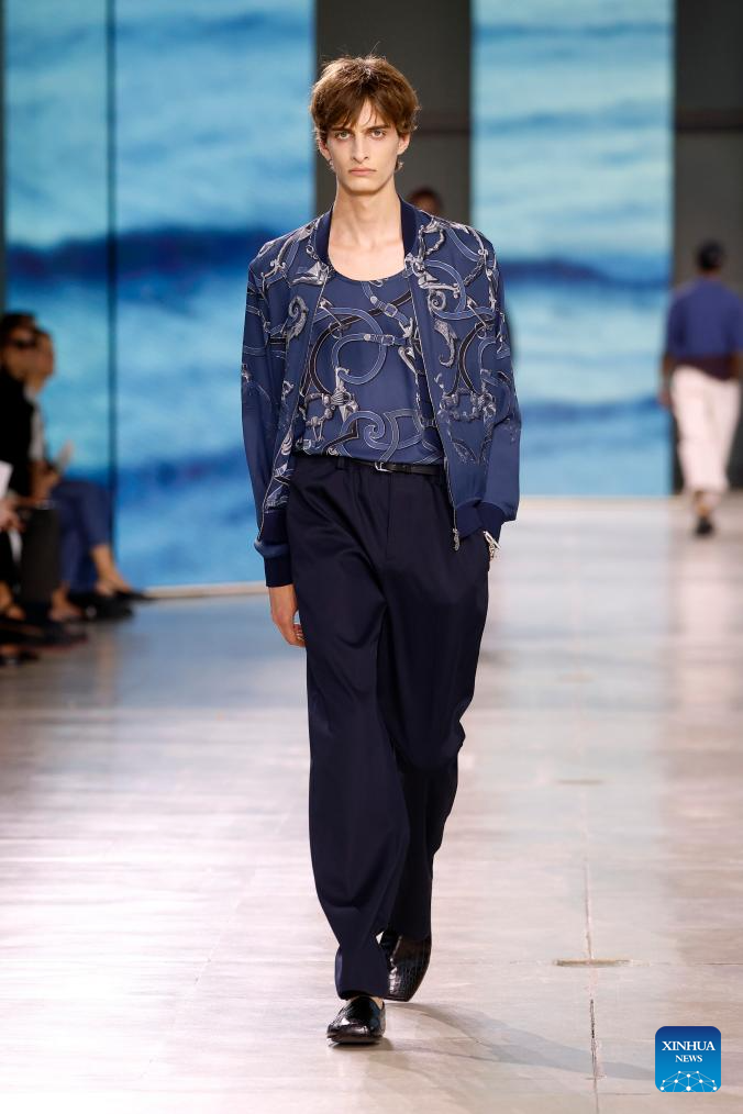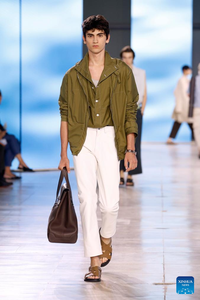 PARIS, 23 junio, 2024 (Xinhua) -- Imagen del 22 de junio de 2024 de un modelo presentando una creación de las colecciones de Ropa para Hombre Primavera/Verano 2025 de Hermes durante la Semana de la Moda de París, en París, Francia (Xinhua/MeetEurope)