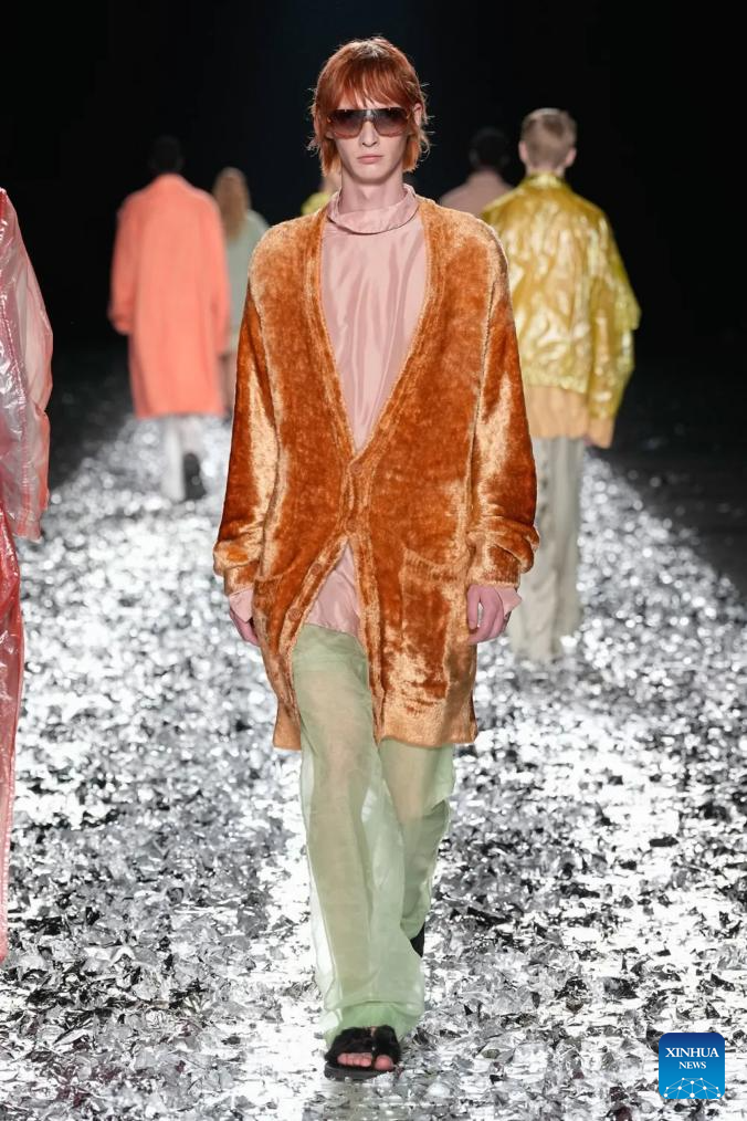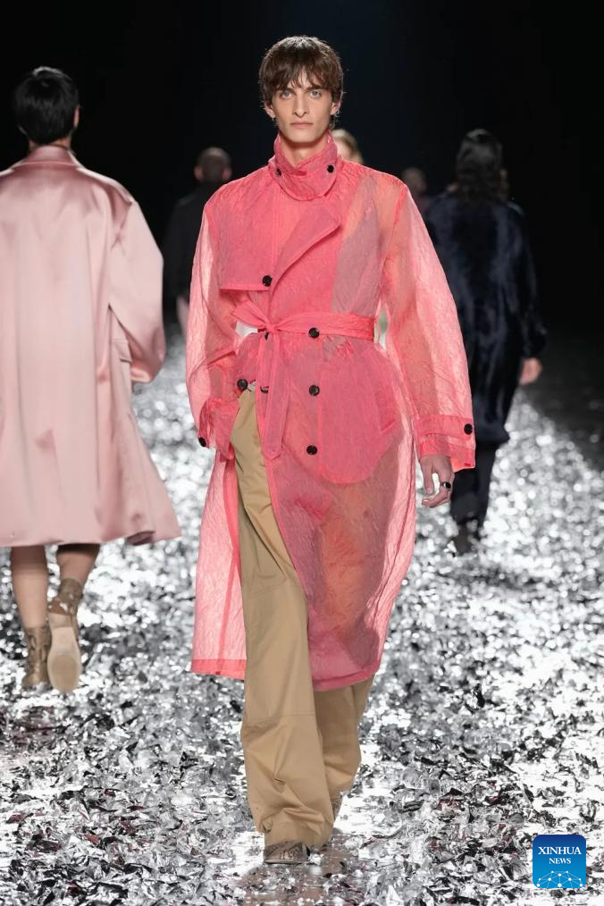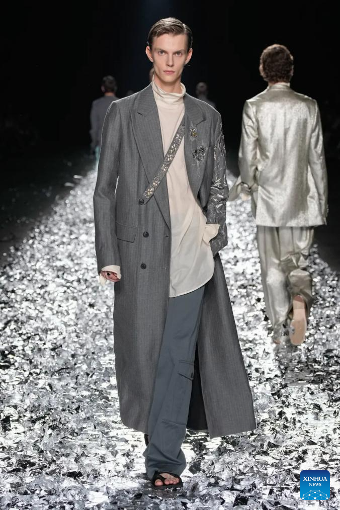 PARIS, 23 junio, 2024 (Xinhua) -- Imagen del 22 de junio de 2024 de un modelo presentando una creación de las colecciones de Ropa para Hombre Primavera/Verano 2025 de Dries Van Noten durante la Semana de la Moda de París, en París, Francia (Xinhua/MeetEurope)