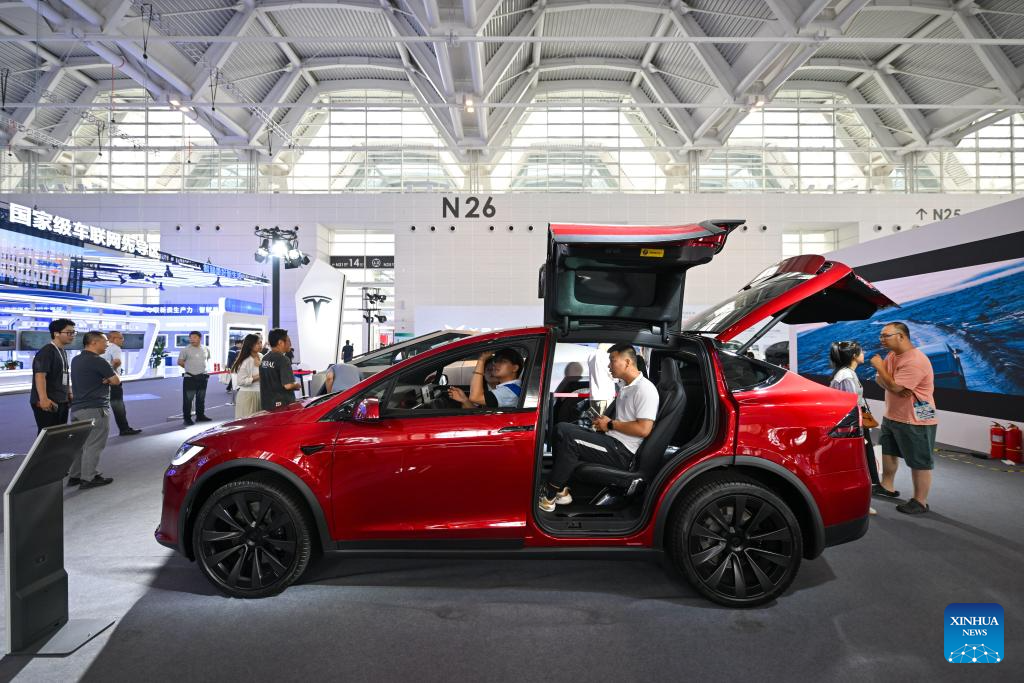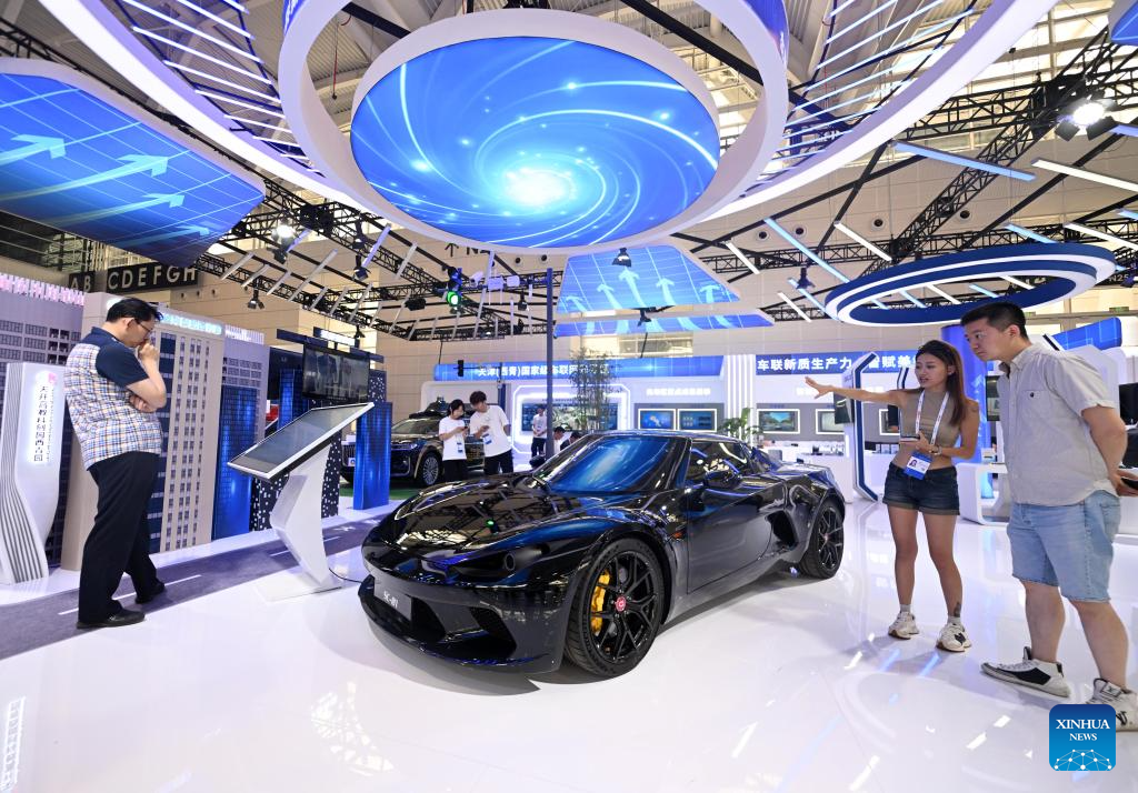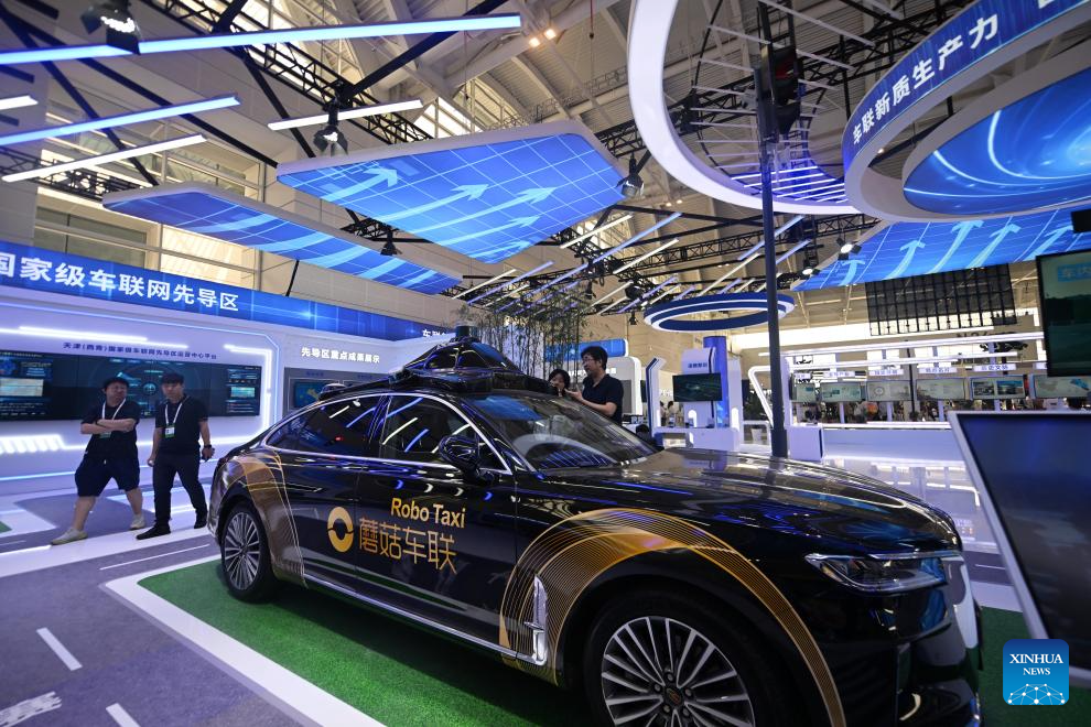 TIANJIN, 23 junio, 2024 (Xinhua) -- Imagen del 22 de junio de 2024 de personas visitando el área de exposiciones de vehículos inteligentes conectados en la Exposición Mundial de Inteligencia 2024, en Tianjin, en el norte de China. La exposición en curso presenta vehículos inteligentes conectados de nueva energía, plataformas de arquitectura, así como plataformas de simulación y prueba desarrolladas por fabricantes automotrices, universidades y otras instituciones nacionales y extranjeras. (Xinhua/Zhao Zishuo)