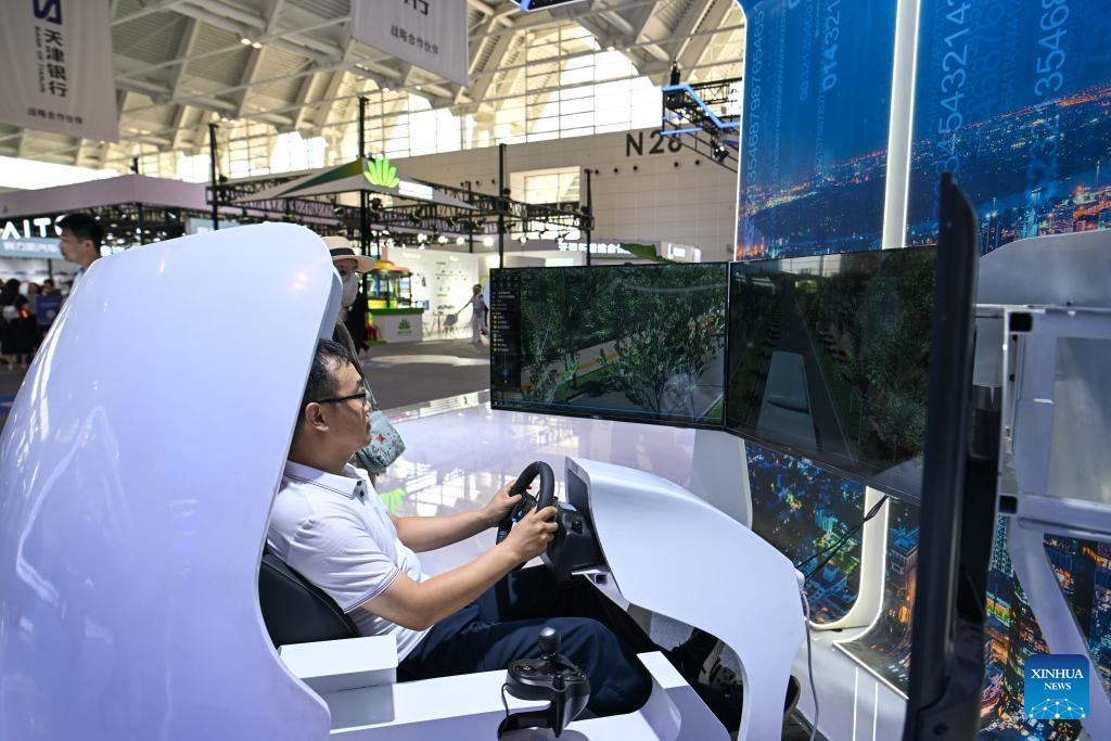 TIANJIN, 23 junio, 2024 (Xinhua) -- Imagen del 22 de junio de 2024 de un visitante probando un simulador de pruebas para vehículos inteligentes conectados en la Exposición Mundial de Inteligencia 2024, en Tianjin, en el norte de China. La exposición en curso presenta vehículos inteligentes conectados de nueva energía, plataformas de arquitectura, así como plataformas de simulación y prueba desarrolladas por fabricantes automotrices, universidades y otras instituciones nacionales y extranjeras. (Xinhua/Sun Fanyue)