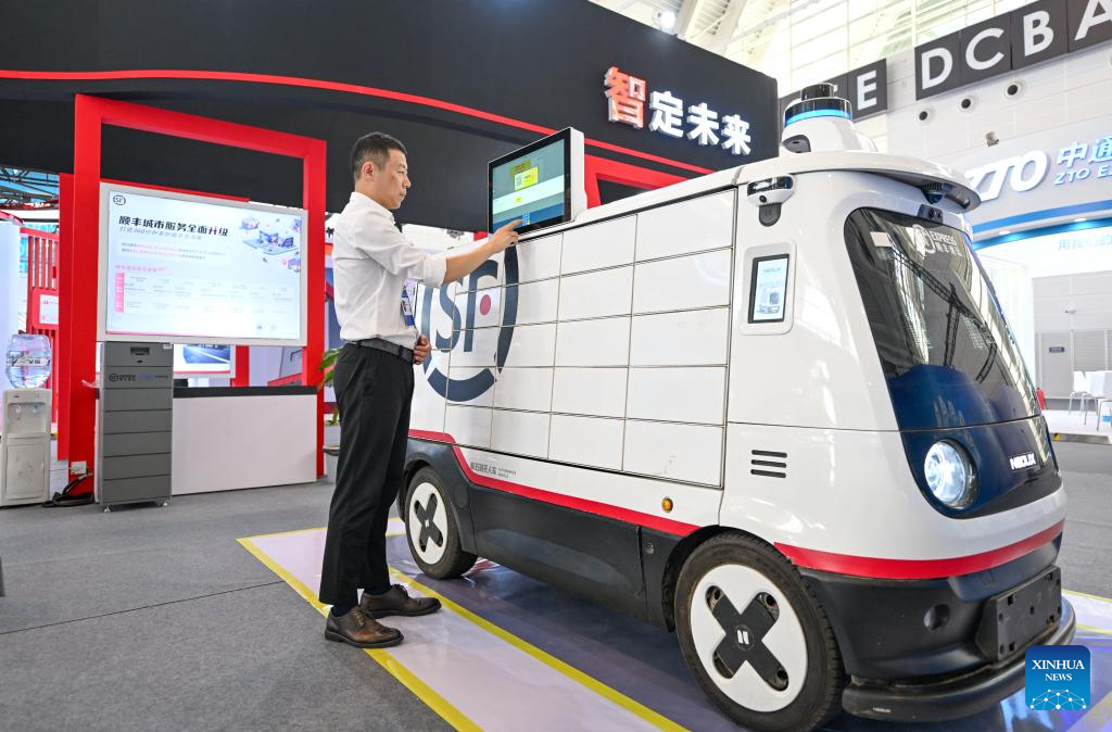 TIANJIN, 23 junio, 2024 (Xinhua) -- Imagen del 20 de junio de 2024 de un expositor operando un vehículo de entrega autónomo no tripulado para un servicio de mensajería presentado en la Exposición Mundial de Inteligencia 2024, en Tianjin, en el norte de China. La exposición en curso presenta vehículos inteligentes conectados de nueva energía, plataformas de arquitectura, así como plataformas de simulación y prueba desarrolladas por fabricantes automotrices, universidades y otras instituciones nacionales y extranjeras. (Xinhua/Sun Fanyue)