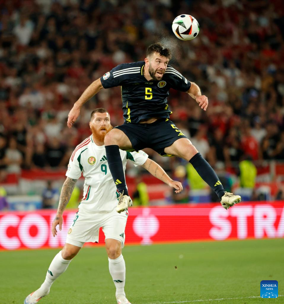 STUTTGART, 24 junio, 2024 (Xinhua) -- Imagen del 23 de junio de 2024 de Grant Hanley (arriba), de Escocia, cabeceando el balón durante el partido correspondiente al Grupo A de la EURO 2024 de la UEFA, entre Escocia y Hungría, en Stuttgart, Alemania. (Xinhua/Philippe Ruiz)