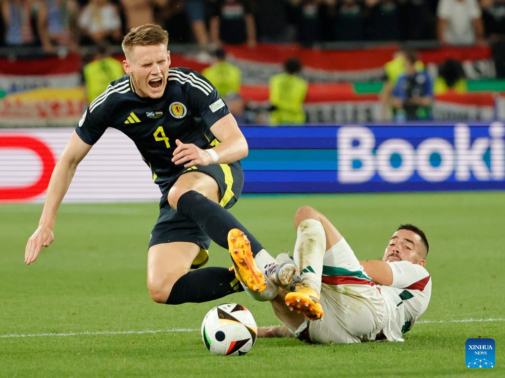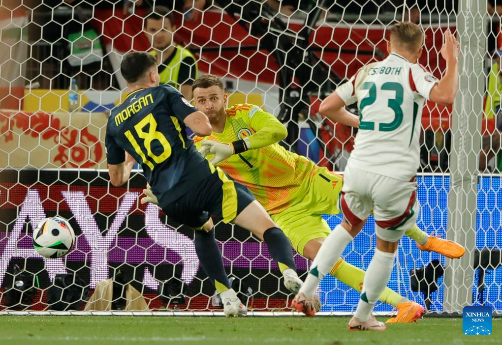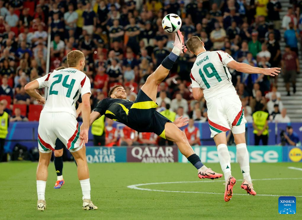 STUTTGART, 24 junio, 2024 (Xinhua) -- Imagen del 23 de junio de 2024 de Che Adams (c), de Escocia, compitiendo durante el partido correspondiente al Grupo A de la EURO 2024 de la UEFA, entre Escocia y Hungría, en Stuttgart, Alemania. (Xinhua/Philippe Ruiz)