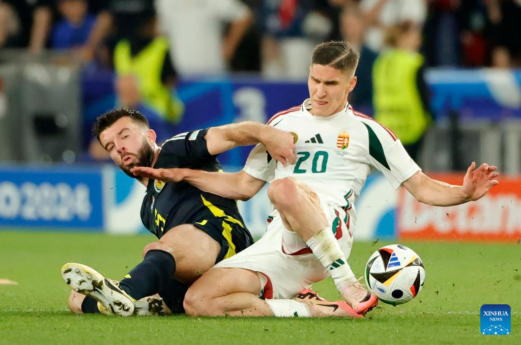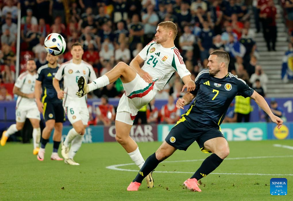 STUTTGART, 24 junio, 2024 (Xinhua) -- Imagen del 23 de junio de 2024 de Kevin Csoboth (d), de Hungría, disparando el balón durante el partido correspondiente al Grupo A de la EURO 2024 de la UEFA, entre Escocia y Hungría, en Stuttgart, Alemania. (Xinhua/Philippe Ruiz)