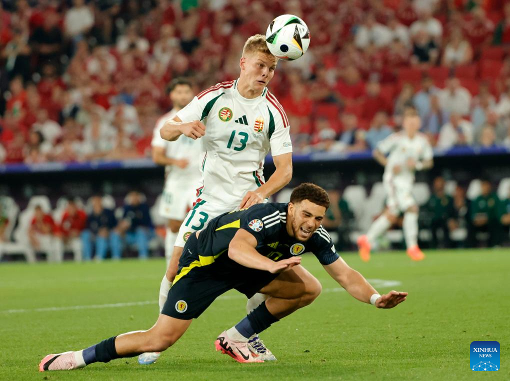 STUTTGART, 24 junio, 2024 (Xinhua) -- Imagen del 23 de junio de 2024 de Andras Schafer (arriba), de Hungría, disputando el balón con Che Adams, de Escocia, durante el partido correspondiente al Grupo A de la EURO 2024 de la UEFA, entre Escocia y Hungría, en Stuttgart, Alemania. (Xinhua/Philippe Ruiz)