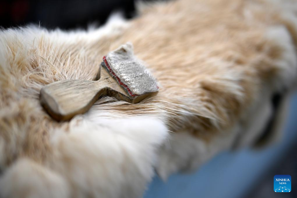 Imagen del 20 de junio de 2024 de un cepillo sobre una pieza de piel de alpaca en la casa del productor peruano, Oswaldo Mamani, en Arequipa, Perú. Oswaldo Mamani es un peruano de 50 años que, radicado en la región sureña de Arequipa, se dedica desde su adolescencia a producir muñecos con pieles de alpaca, una experiencia que le ha llevado a independizarse laboralmente y a emprender en los últimos años un camino de negocio exitoso con el mercado chino. (Xinhua/Li Muzi)