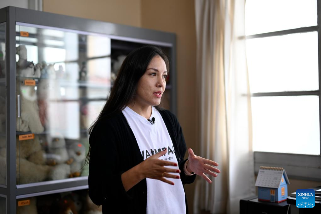 Imagen del 20 de junio de 2024 de Alejandra Bedregal, socia del productor peruano, Oswaldo Mamani, conversando con la Agencia de Noticias Xinhua durante una entrevista, en Arequipa, Perú. Oswaldo Mamani es un peruano de 50 años que, radicado en la región sureña de Arequipa, se dedica desde su adolescencia a producir muñecos con pieles de alpaca, una experiencia que le ha llevado a independizarse laboralmente y a emprender en los últimos años un camino de negocio exitoso con el mercado chino. (Xinhua/Li Muzi)