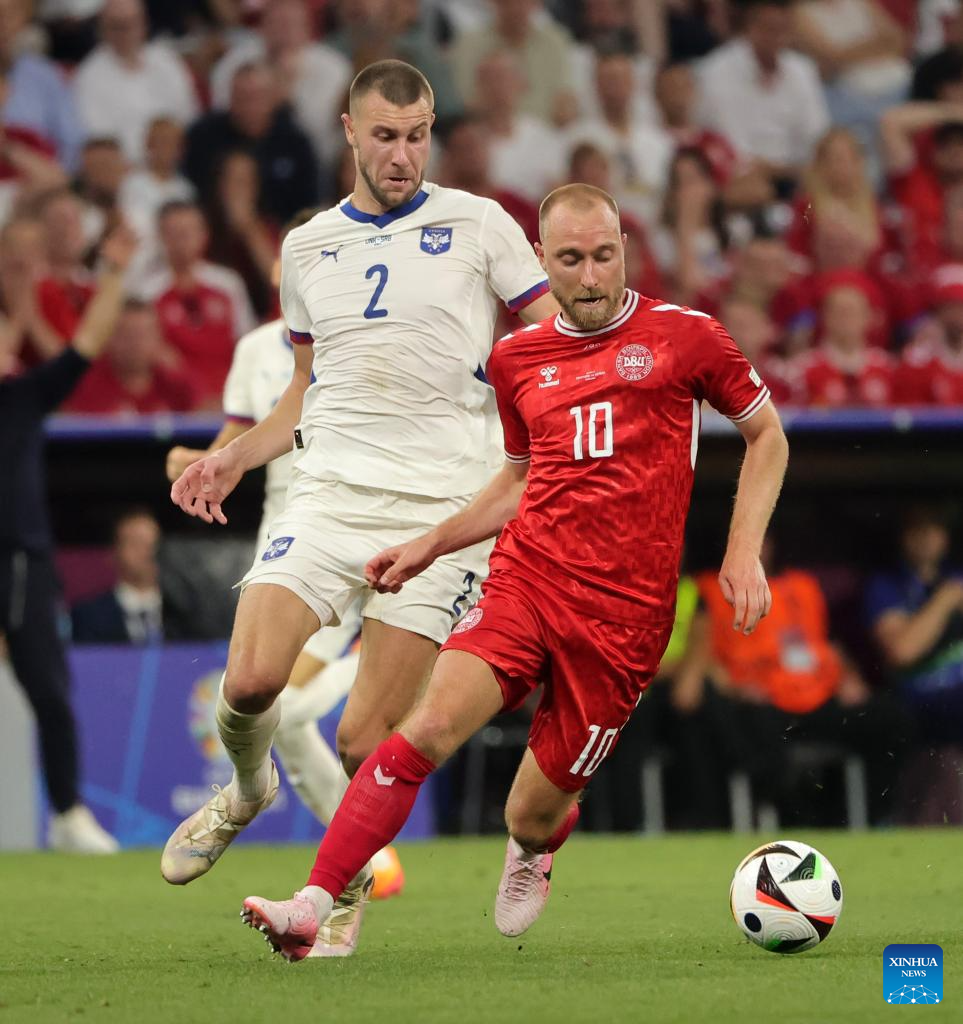 MUNICH, 26 junio, 2024 (Xinhua) -- Imagen del 25 de junio de 2024 de Christian Eriksen (d), de Dinamarca, compitiendo con Strahinja Pavlovic, de Serbia, durante el partido correspondiente al Grupo C de la EURO 2024 de la UEFA, entre Dinamarca y Serbia, en Múnich, Alemania. (Xinhua/Philippe Ruiz)
