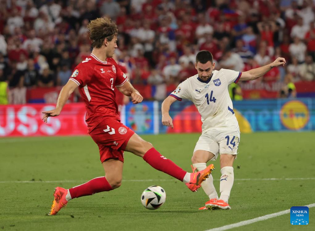 MUNICH, 26 junio, 2024 (Xinhua) -- Imagen del 25 de junio de 2024 de Joachim Andersen (i), de Dinamarca, compitiendo con Andrija Zivkovic, de Serbia, durante el partido correspondiente al Grupo C de la EURO 2024 de la UEFA, entre Dinamarca y Serbia, en Múnich, Alemania. (Xinhua/Philippe Ruiz)