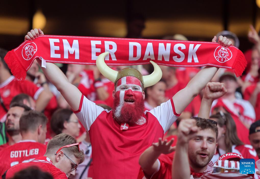 MUNICH, 26 junio, 2024 (Xinhua) -- Imagen del 25 de junio de 2024 de aficionados del equipo de Dinamarca animando previo al partido correspondiente al Grupo C de la EURO 2024 de la UEFA, entre Dinamarca y Serbia, en Múnich, Alemania. (Xinhua/Philippe Ruiz)