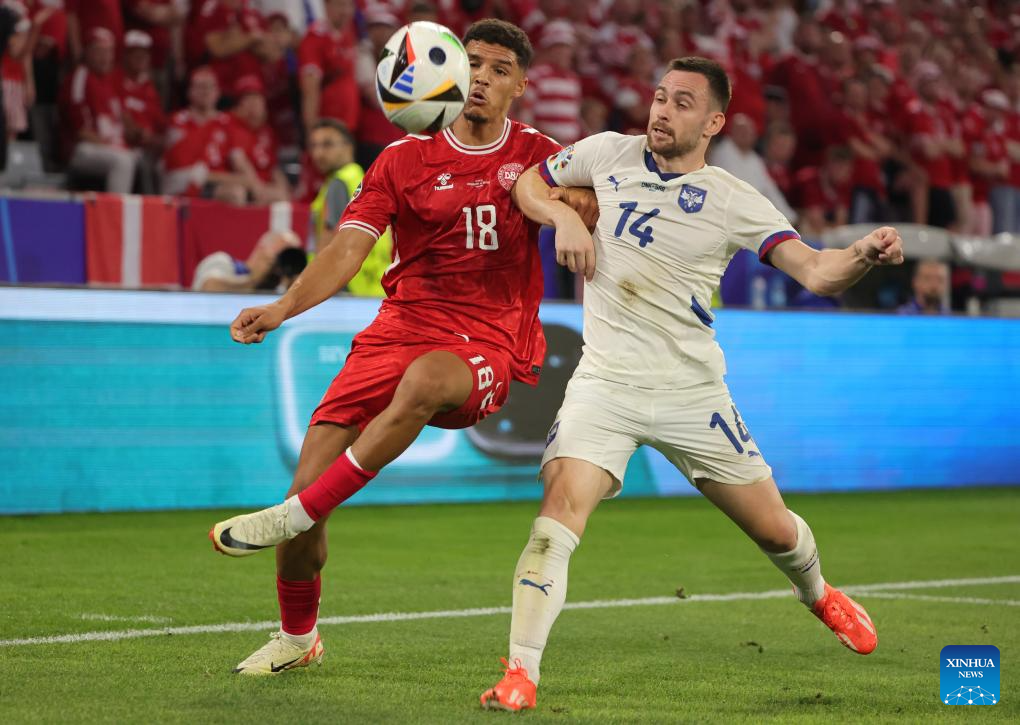 MUNICH, 26 junio, 2024 (Xinhua) -- Imagen del 25 de junio de 2024 de Alexander Bah (i), de Dinamarca, compitiendo con Andrija Zivkovic, de Serbia, durante el partido correspondiente al Grupo C de la EURO 2024 de la UEFA, entre Dinamarca y Serbia, en Múnich, Alemania. (Xinhua/Philippe Ruiz)