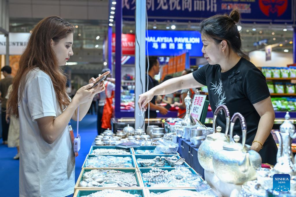 URUMQI, 26 junio, 2024 (Xinhua) -- Una visitante observan joyería de plata en la VIII Exposición China-Eurasia, en Urumqi, en la región autónoma uygur de Xinjiang, en el noroeste de China, el 26 de junio de 2024. La VIII Exposición China-Eurasia, celebrada en el Centro Internacional de Convenciones y Exposiciones de Xinjiang, al pie de las montañas Tianshan, comenzó el miércoles en Urumqi, en la región autónoma uygur de Xinjiang, en el noroeste de China. Con el tema "Nuevas oportunidades de la Ruta de la Seda, Nueva Vitalidad para la Cooperación Euroasiática", la exposición se extenderá hasta el domingo. Ha atraído a más de 1.900 participantes de 50 países, regiones y organizaciones internacionales, mostrando más de 6.000 variedades de productos. (Xinhua/Chen Shuo)
