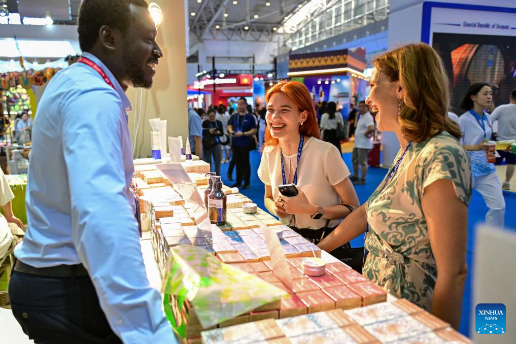 URUMQI, 26 junio, 2024 (Xinhua) -- Dos compradoras se comunican con un trabajador en el estand de Ghana en la VIII Exposición China-Eurasia, en Urumqi, en la región autónoma uygur de Xinjiang, en el noroeste de China, el 26 de junio de 2024. La VIII Exposición China-Eurasia, celebrada en el Centro Internacional de Convenciones y Exposiciones de Xinjiang, al pie de las montañas Tianshan, comenzó el miércoles en Urumqi, en la región autónoma uygur de Xinjiang, en el noroeste de China. Con el tema "Nuevas oportunidades de la Ruta de la Seda, Nueva Vitalidad para la Cooperación Euroasiática", la exposición se extenderá hasta el domingo. Ha atraído a más de 1.900 participantes de 50 países, regiones y organizaciones internacionales, mostrando más de 6.000 variedades de productos. (Xinhua/Ding Lei)