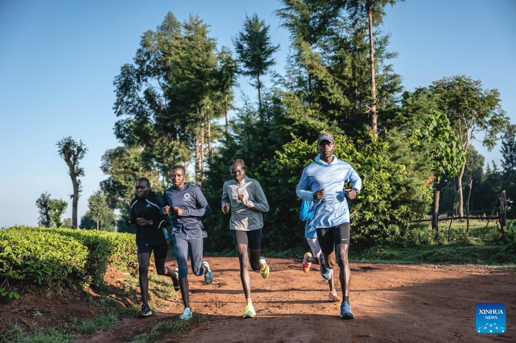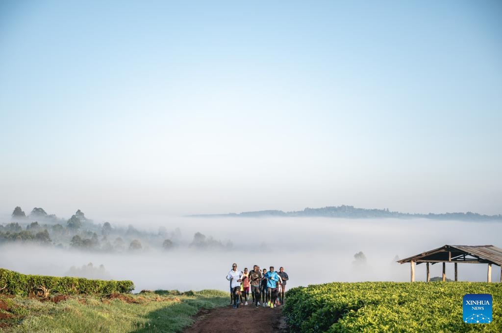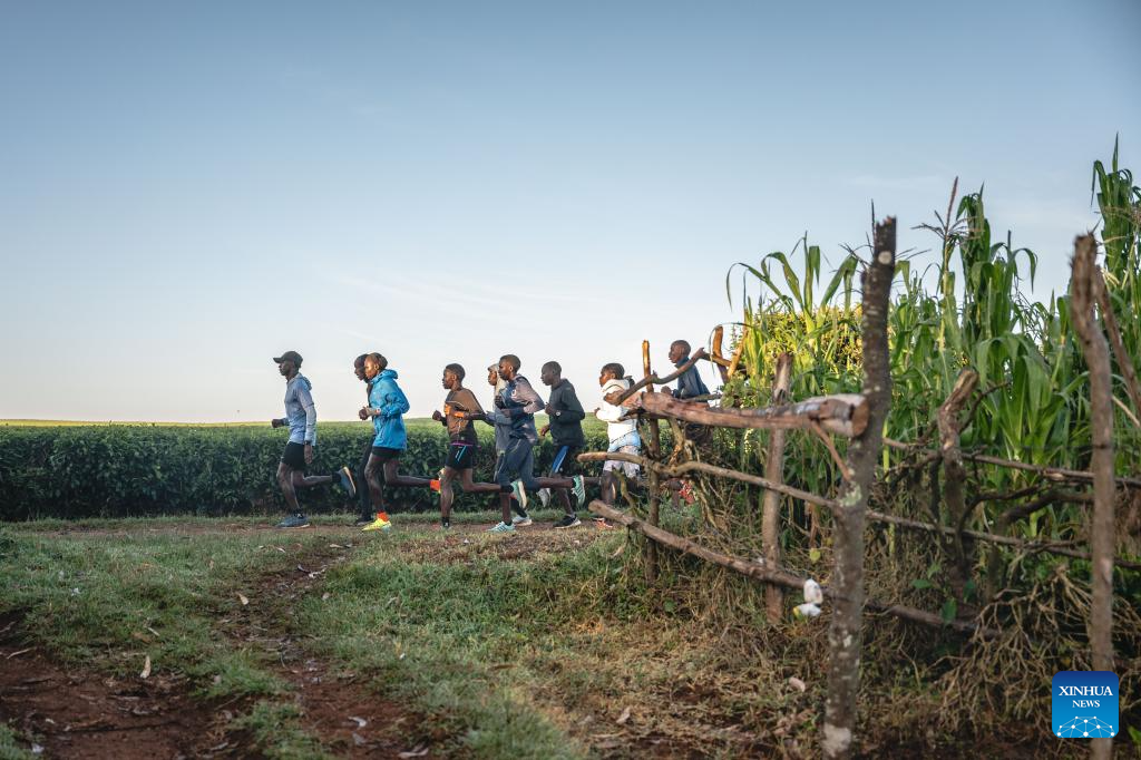 NAIROBI, 26 junio, 2024 (Xinhua) -- Imagen del 22 de junio de 2024 de Perina (3-i) corriendo durante la sesión matutina, en el condado de Nandi, en el oeste de Kenia. Afrontando el clima frío de la madrugada, un grupo de atletas corre por las colinas de Nandi, situadas a unos 350 kilómetros al noroeste de Nairobi, como parte de su rutina diaria para desarrollar la resistencia necesaria para las carreras de media y larga distancia. Perina Lokure Nakang, una joven refugiada de Sudán del Sur, forma parte del grupo que se encuentra en sus preparativos finales para los Juegos Olímpicos de Verano de 2024, que se celebrarán en París, Francia, a finales de julio. La joven de 21 años fue seleccionada para formar parte del Equipo Olímpico de Refugiados, donde competirá en la carrera de 800 metros. (Xinhua/Wang Guansen)