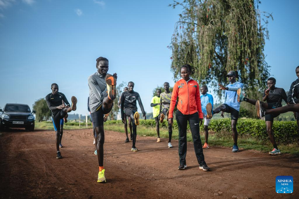 NAIROBI, 26 junio, 2024 (Xinhua) -- Imagen del 22 de junio de 2024 de Perina (i-frente) estirándose después del entrenamiento matutino, en el condado de Nandi, en el oeste de Kenia. Afrontando el clima frío de la madrugada, un grupo de atletas corre por las colinas de Nandi, situadas a unos 350 kilómetros al noroeste de Nairobi, como parte de su rutina diaria para desarrollar la resistencia necesaria para las carreras de media y larga distancia. Perina Lokure Nakang, una joven refugiada de Sudán del Sur, forma parte del grupo que se encuentra en sus preparativos finales para los Juegos Olímpicos de Verano de 2024, que se celebrarán en París, Francia, a finales de julio. La joven de 21 años fue seleccionada para formar parte del Equipo Olímpico de Refugiados, donde competirá en la carrera de 800 metros. (Xinhua/Wang Guansen)