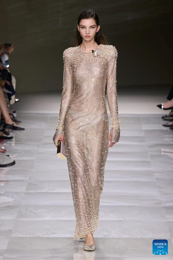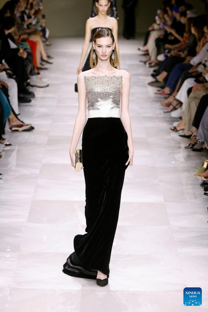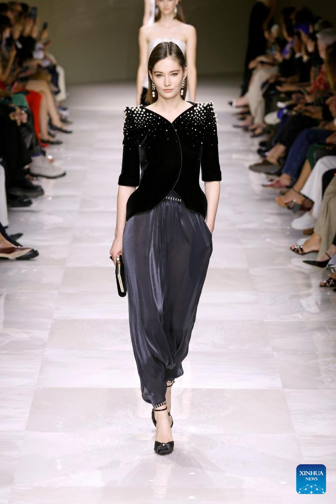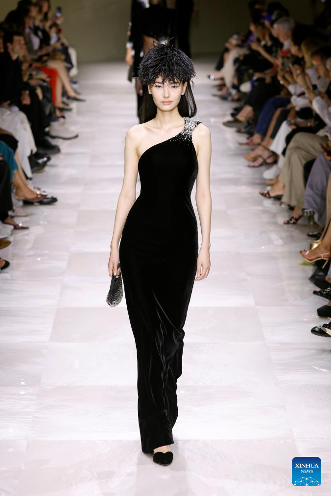 PARIS, 26 junio, 2024 (Xinhua) -- Imagen del 25 de junio de 2024 de una modelo presentando una creación de las colecciones de Alta Costura Otoño/Invierno 2024-2025 de Giorgio Armani Privé durante la Semana de la Moda de París, en París, Francia. (Xinhua/MeetEurope)