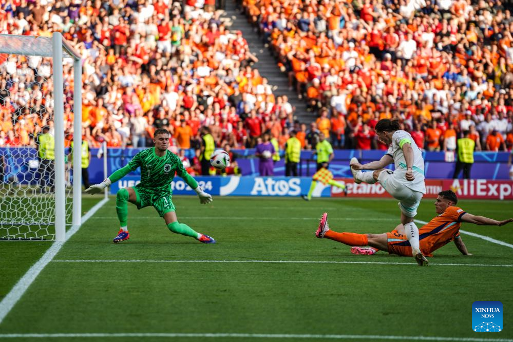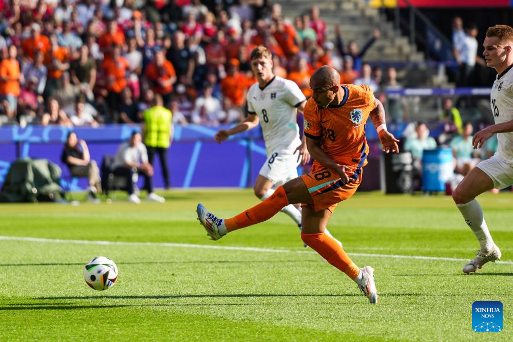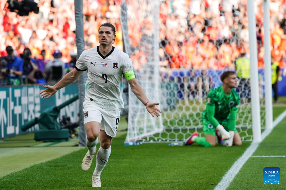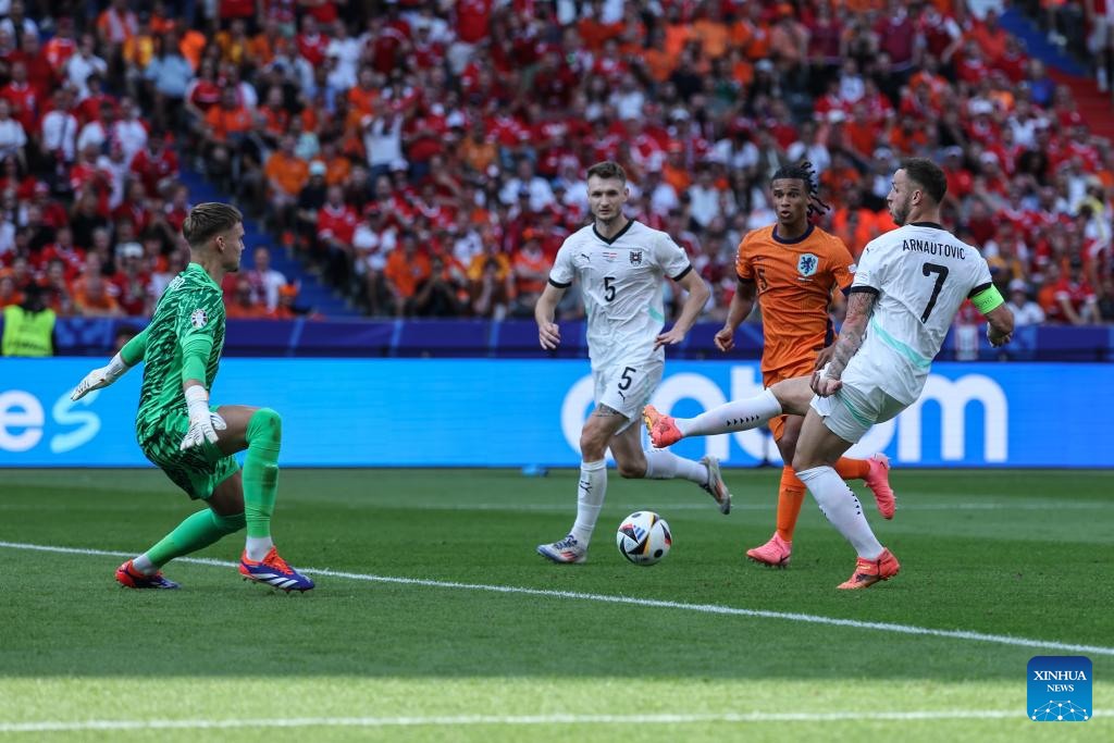 BERLIN, 26 junio, 2024 (Xinhua) -- Imagen del 25 de junio de 2024 de Marko Arnautovic (d), de Austria, disparando el balón durante el partido correspondiente al Grupo D de la EURO 2024 de la UEFA, entre Países Bajos y Austria, en Berlín, Alemania. (Xinhua/Pan Yulong)