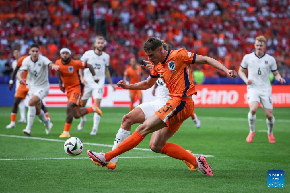 BERLIN, 26 junio, 2024 (Xinhua) -- Imagen del 25 de junio de 2024 de Micky van de Ven (frente), de Países Bajos, disparando el balón durante el partido correspondiente al Grupo D de la EURO 2024 de la UEFA, entre Países Bajos y Austria, en Berlín, Alemania. (Xinhua/Pan Yulong)
